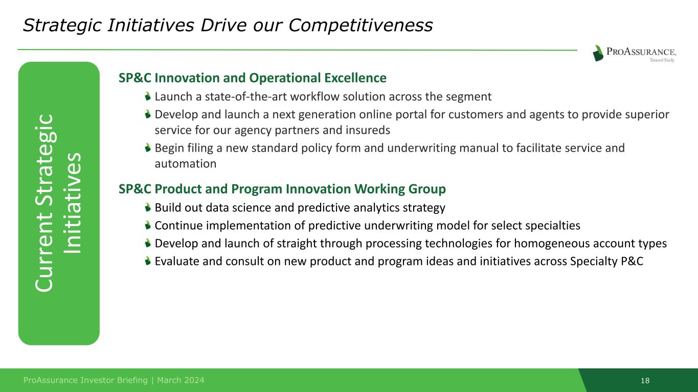 ProAssurance Investor Briefing | March 2024 17 A Foundation in Excellence “From our earliest days, we have operated with a strategy both responsive to near-term challenges and proactive to long-term opportunity.” -Ned Rand President & CEO Superior brand identity and reputation in the market Specialization • Deep expertise and commitment to our customers throughout the insurance cycles enable us to outperform our peers over time Experienced & Collaborative Leadership • Average executive leadership tenure of 20 years with PRA or subsidiaries History of Successful M&A • Selective M&A with best-in-class partners, and nearly 20 transactions in our 47 year history Scope & Scale • Regional hubs combined with local knowledge of market dynamics and regulatory environments