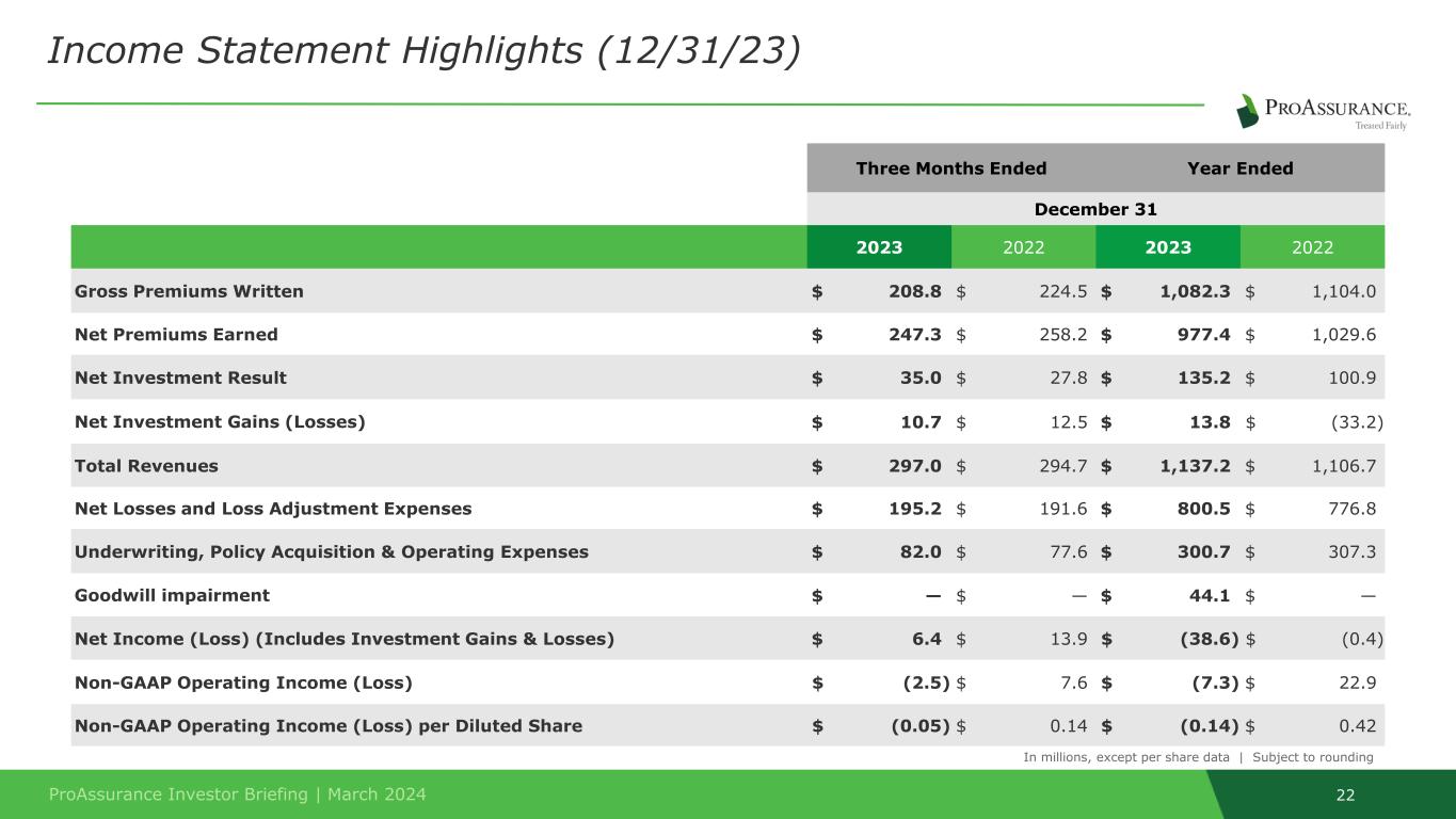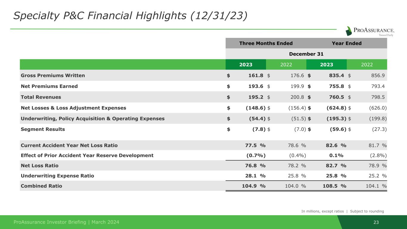 ProAssurance Investor Briefing | March 2024 22 Income Statement Highlights (12/31/23) In millions, except per share data | Subject to rounding Three Months Ended Year Ended December 31 2023 2022 2023 2022 Gross Premiums Written $ 208.8 $ 224.5 $ 1,082.3 $ 1,104.0 Net Premiums Earned $ 247.3 $ 258.2 $ 977.4 $ 1,029.6 Net Investment Result $ 35.0 $ 27.8 $ 135.2 $ 100.9 Net Investment Gains (Losses) $ 10.7 $ 12.5 $ 13.8 $ (33.2) Total Revenues $ 297.0 $ 294.7 $ 1,137.2 $ 1,106.7 Net Losses and Loss Adjustment Expenses $ 195.2 $ 191.6 $ 800.5 $ 776.8 Underwriting, Policy Acquisition & Operating Expenses $ 82.0 $ 77.6 $ 300.7 $ 307.3 Goodwill impairment $ — $ — $ 44.1 $ — Net Income (Loss) (Includes Investment Gains & Losses) $ 6.4 $ 13.9 $ (38.6) $ (0.4) Non-GAAP Operating Income (Loss) $ (2.5) $ 7.6 $ (7.3) $ 22.9 Non-GAAP Operating Income (Loss) per Diluted Share $ (0.05) $ 0.14 $ (0.14) $ 0.42