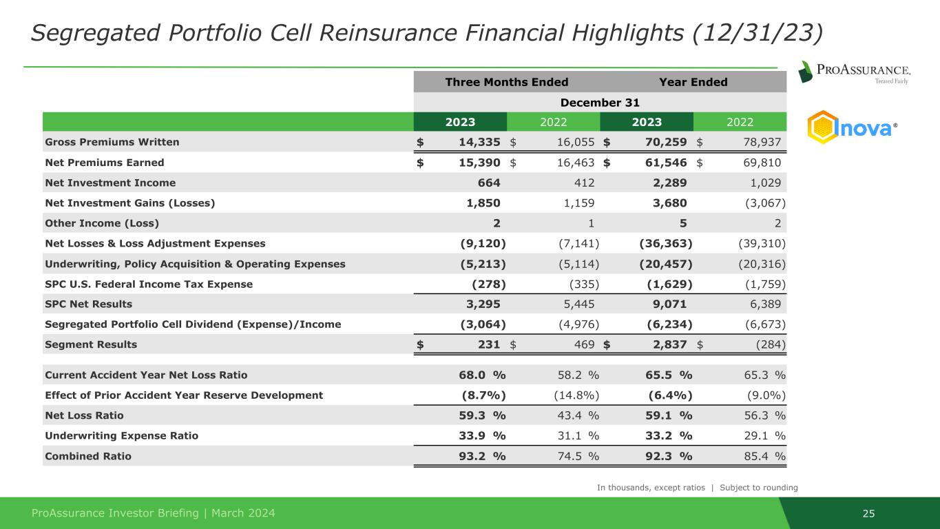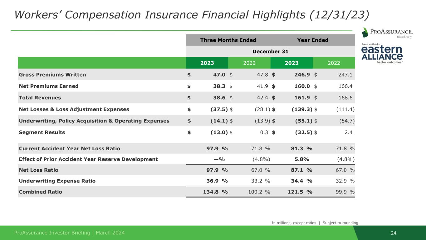 ProAssurance Investor Briefing | March 2024 23 Current Accident Year Net Loss Ratio 77.5 % 78.6 % 82.6 % 81.7 % Effect of Prior Accident Year Reserve Development (0.7%) (0.4%) 0.1% (2.8%) Net Loss Ratio 76.8 % 78.2 % 82.7 % 78.9 % Underwriting Expense Ratio 28.1 % 25.8 % 25.8 % 25.2 % Combined Ratio 104.9 % 104.0 % 108.5 % 104.1 % Specialty P&C Financial Highlights (12/31/23) Three Months Ended Year Ended December 31 2023 2022 2023 2022 Gross Premiums Written $ 161.8 $ 176.6 $ 835.4 $ 856.9 Net Premiums Earned $ 193.6 $ 199.9 $ 755.8 $ 793.4 Total Revenues $ 195.2 $ 200.8 $ 760.5 $ 798.5 Net Losses & Loss Adjustment Expenses $ (148.6) $ (156.4) $ (624.8) $ (626.0) Underwriting, Policy Acquisition & Operating Expenses $ (54.4) $ (51.5) $ (195.3) $ (199.8) Segment Results $ (7.8) $ (7.0) $ (59.6) $ (27.3) In millions, except ratios | Subject to rounding