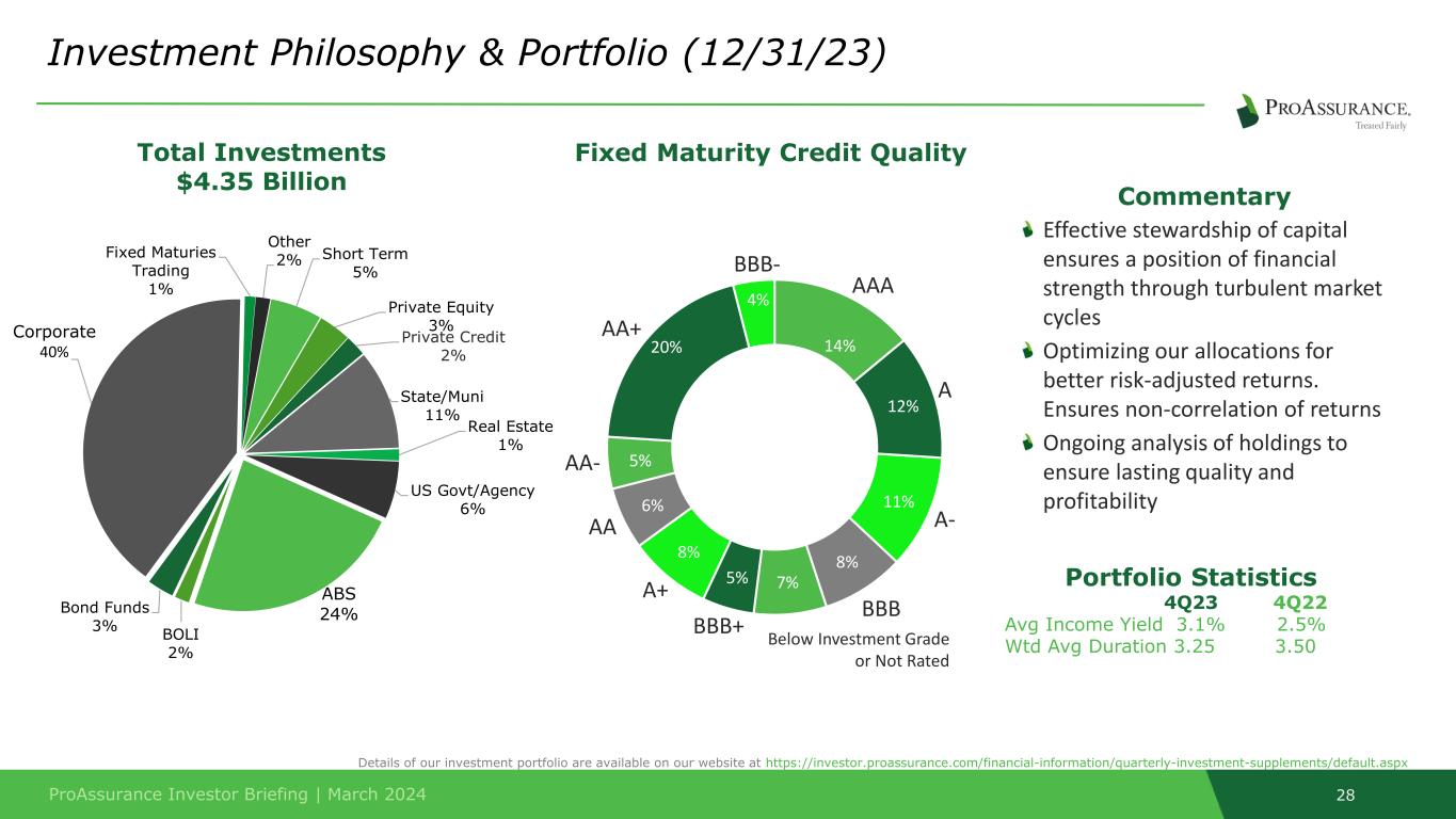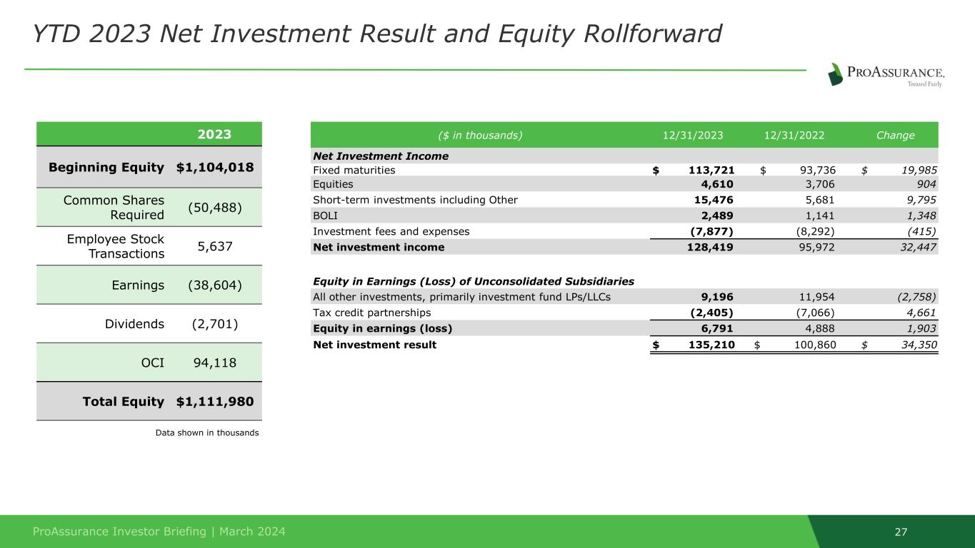 ProAssurance Investor Briefing | March 2024 27 YTD 2023 Net Investment Result and Equity Rollforward Data shown in thousands 2023 Beginning Equity $1,104,018 Common Shares Required (50,488) Employee Stock Transactions 5,637 Earnings (38,604) Dividends (2,701) OCI 94,118 Total Equity $1,111,980 ($ in thousands) 12/31/2023 12/31/2022 Change Net Investment Income Fixed maturities $ 113,721 $ 93,736 $ 19,985 Equities 4,610 3,706 904 Short-term investments including Other 15,476 5,681 9,795 BOLI 2,489 1,141 1,348 Investment fees and expenses (7,877) (8,292) (415) Net investment income 128,419 95,972 32,447 Equity in Earnings (Loss) of Unconsolidated Subsidiaries All other investments, primarily investment fund LPs/LLCs 9,196 11,954 (2,758) Tax credit partnerships (2,405) (7,066) 4,661 Equity in earnings (loss) 6,791 4,888 1,903 Net investment result $ 135,210 $ 100,860 $ 34,350