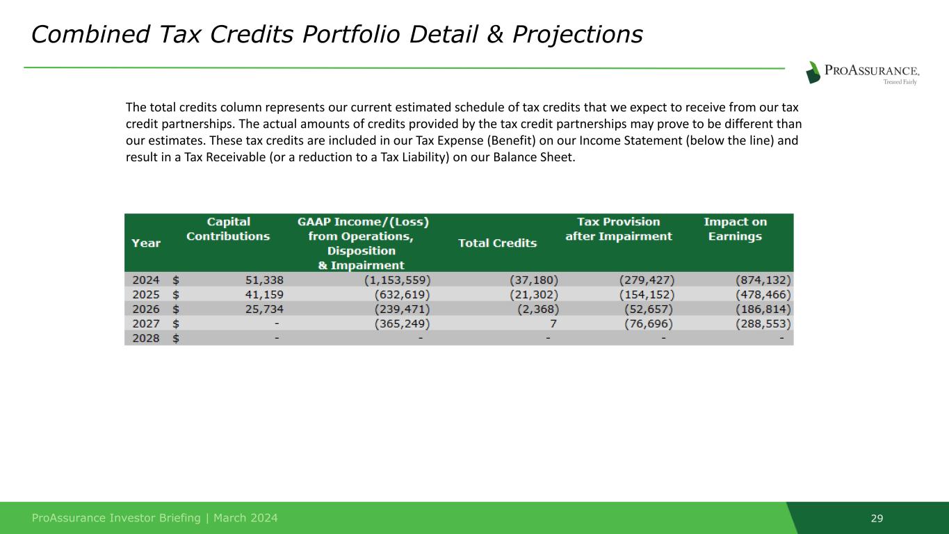 ProAssurance Investor Briefing | March 2024 29 Combined Tax Credits Portfolio Detail & Projections The total credits column represents our current estimated schedule of tax credits that we expect to receive from our tax credit partnerships. The actual amounts of credits provided by the tax credit partnerships may prove to be different than our estimates. These tax credits are included in our Tax Expense (Benefit) on our Income Statement (below the line) and result in a Tax Receivable (or a reduction to a Tax Liability) on our Balance Sheet.