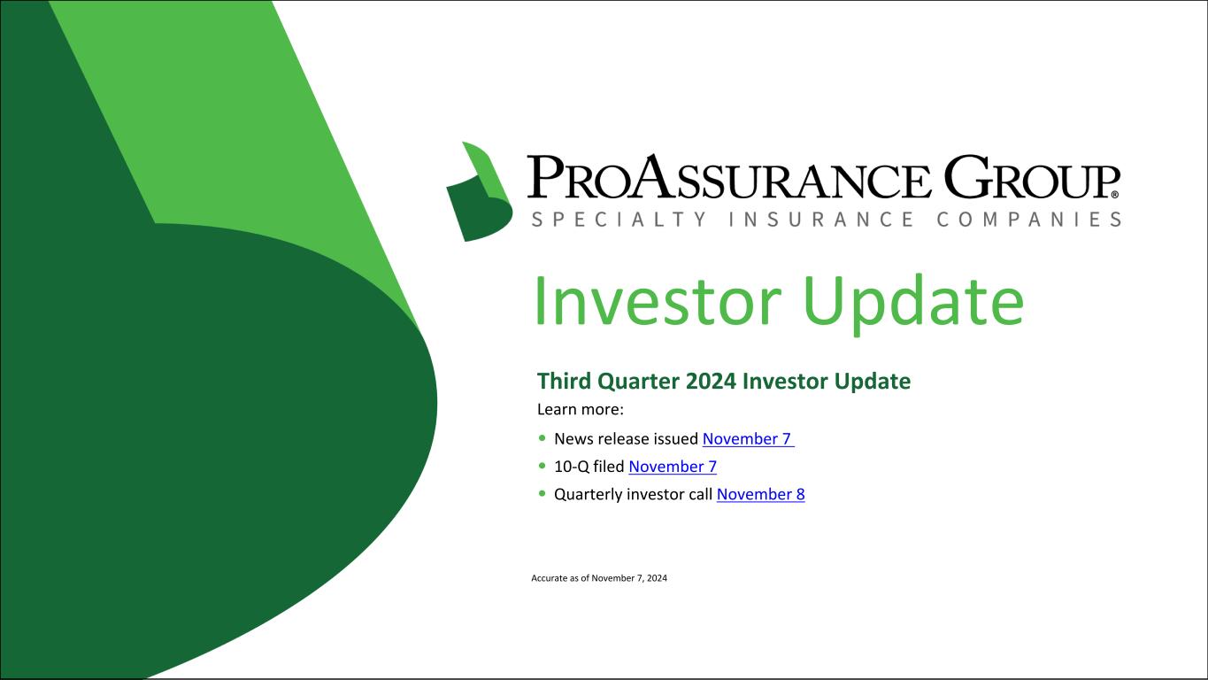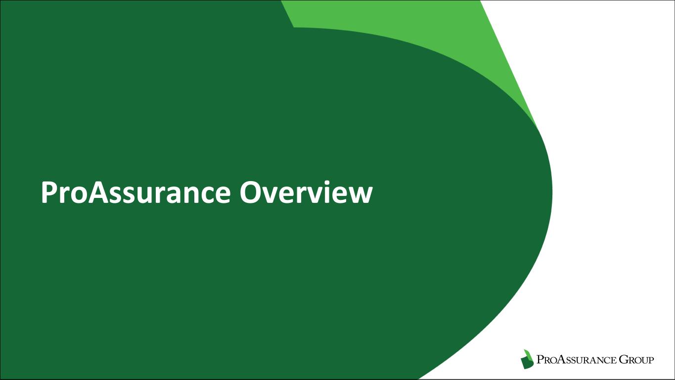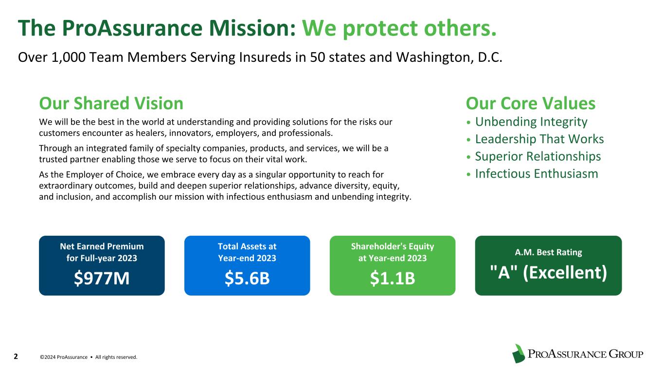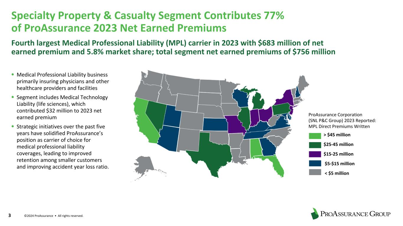 ©2024 ProAssurance • All rights reserved. 2 Our Shared Vision We will be the best in the world at understanding and providing solutions for the risks our customers encounter as healers, innovators, employers, and professionals. Through an integrated family of specialty companies, products, and services, we will be a trusted partner enabling those we serve to focus on their vital work. As the Employer of Choice, we embrace every day as a singular opportunity to reach for extraordinary outcomes, build and deepen superior relationships, advance diversity, equity, and inclusion, and accomplish our mission with infectious enthusiasm and unbending integrity. Our Core Values • Unbending Integrity • Leadership That Works • Superior Relationships • Infectious Enthusiasm The ProAssurance Mission: We protect others. Over 1,000 Team Members Serving Insureds in 50 states and Washington, D.C. Net Earned Premium for Full-year 2023 $977M Total Assets at Year-end 2023 $5.6B Shareholder's Equity at Year-end 2023 $1.1B A.M. Best Rating "A" (Excellent)