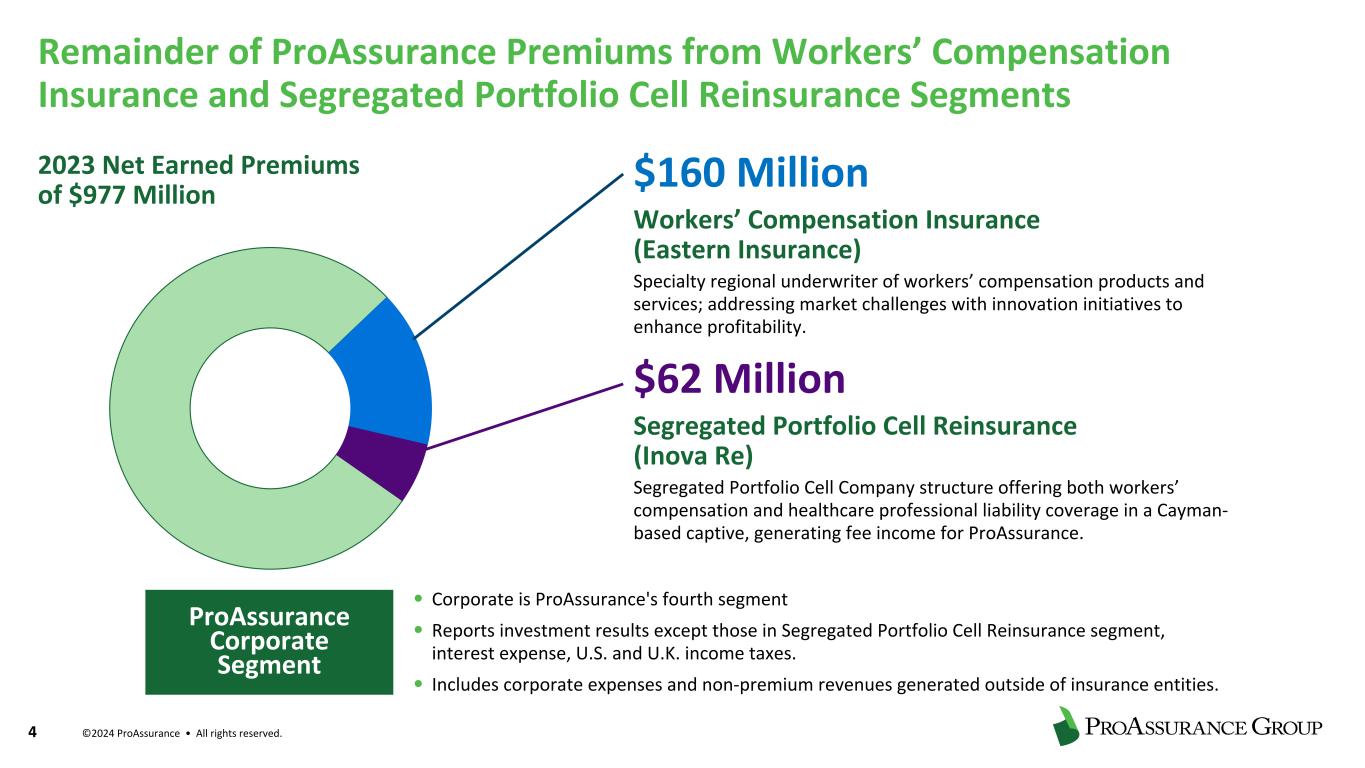 ©2024 ProAssurance • All rights reserved. 3 ProAssurance Corporation (SNL P&C Group) 2023 Reported: MPL Direct Premiums Written > $45 million $25-45 million $15-25 million $5-$15 million < $5 million Fourth largest Medical Professional Liability (MPL) carrier in 2023 with $683 million of net earned premium and 5.8% market share; total segment net earned premiums of $756 million Specialty Property & Casualty Segment Contributes 77% of ProAssurance 2023 Net Earned Premiums • Medical Professional Liability business primarily insuring physicians and other healthcare providers and facilities • Segment includes Medical Technology Liability (life sciences), which contributed $32 million to 2023 net earned premium • Strategic initiatives over the past five years have solidified ProAssurance’s position as carrier of choice for medical professional liability coverages, leading to improved retention among smaller customers and improving accident year loss ratio.