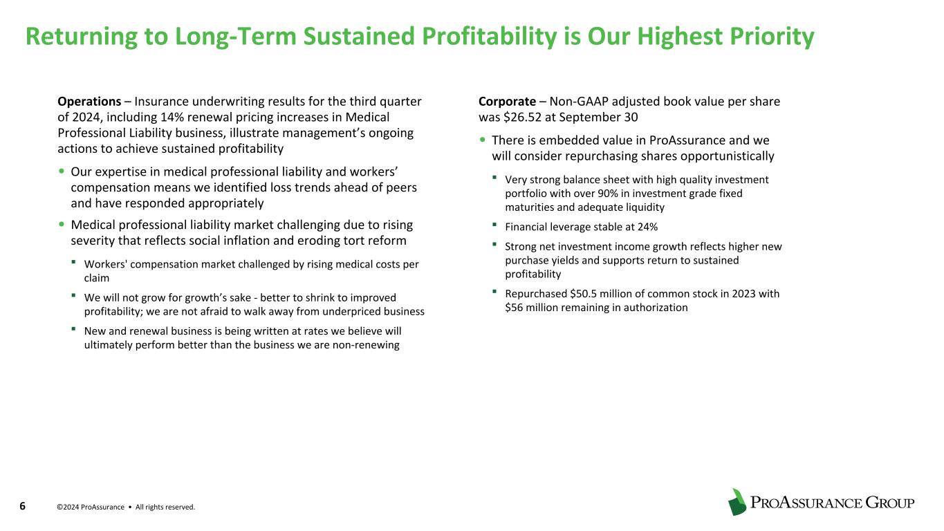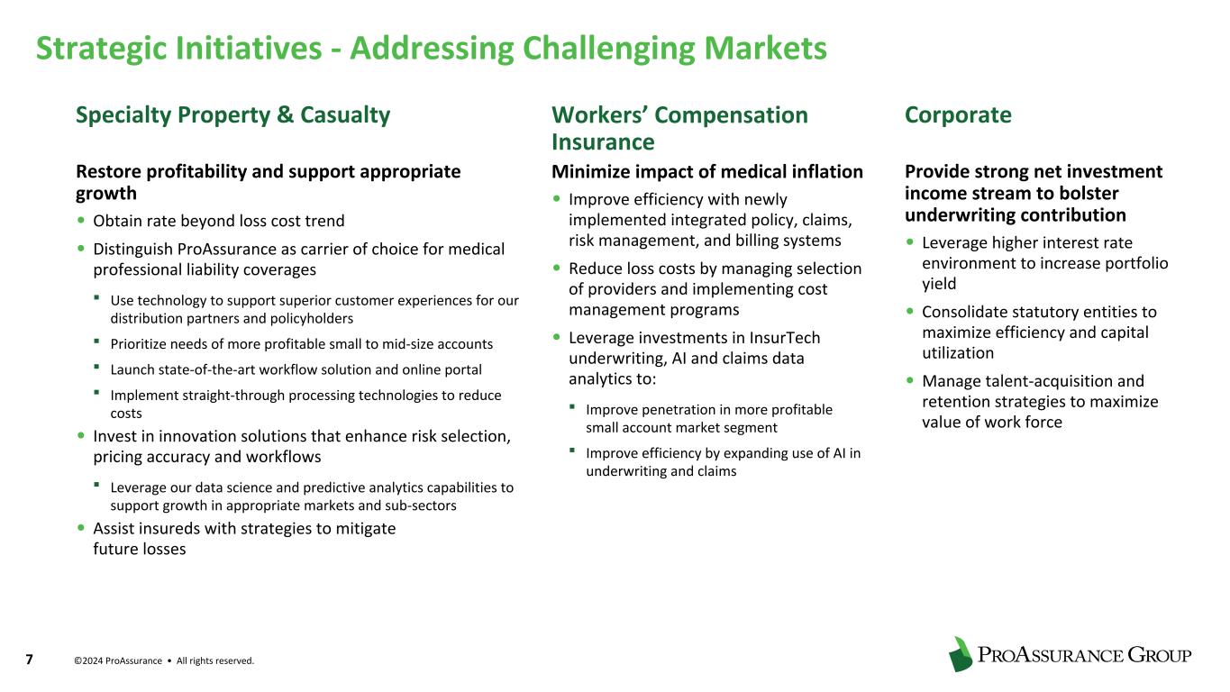 ©2024 ProAssurance • All rights reserved. 6 Operations – Insurance underwriting results for the third quarter of 2024, including 14% renewal pricing increases in Medical Professional Liability business, illustrate management’s ongoing actions to achieve sustained profitability • Our expertise in medical professional liability and workers’ compensation means we identified loss trends ahead of peers and have responded appropriately • Medical professional liability market challenging due to rising severity that reflects social inflation and eroding tort reform ▪ Workers' compensation market challenged by rising medical costs per claim ▪ We will not grow for growth’s sake - better to shrink to improved profitability; we are not afraid to walk away from underpriced business ▪ New and renewal business is being written at rates we believe will ultimately perform better than the business we are non-renewing Corporate – Non-GAAP adjusted book value per share was $26.52 at September 30 • There is embedded value in ProAssurance and we will consider repurchasing shares opportunistically ▪ Very strong balance sheet with high quality investment portfolio with over 90% in investment grade fixed maturities and adequate liquidity ▪ Financial leverage stable at 24% ▪ Strong net investment income growth reflects higher new purchase yields and supports return to sustained profitability ▪ Repurchased $50.5 million of common stock in 2023 with $56 million remaining in authorization Returning to Long-Term Sustained Profitability is Our Highest Priority