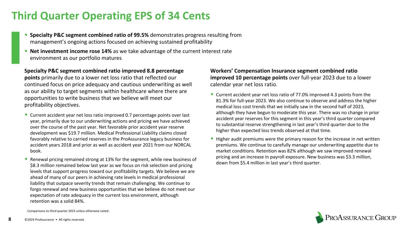 ©2024 ProAssurance • All rights reserved. 7 Corporate Provide strong net investment income stream to bolster underwriting contribution • Leverage higher interest rate environment to increase portfolio yield • Consolidate statutory entities to maximize efficiency and capital utilization • Manage talent-acquisition and retention strategies to maximize value of work force Workers’ Compensation Insurance Minimize impact of medical inflation • Improve efficiency with newly implemented integrated policy, claims, risk management, and billing systems • Reduce loss costs by managing selection of providers and implementing cost management programs • Leverage investments in InsurTech underwriting, AI and claims data analytics to: ▪ Improve penetration in more profitable small account market segment ▪ Improve efficiency by expanding use of AI in underwriting and claims Strategic Initiatives - Addressing Challenging Markets Specialty Property & Casualty Restore profitability and support appropriate growth • Obtain rate beyond loss cost trend • Distinguish ProAssurance as carrier of choice for medical professional liability coverages ▪ Use technology to support superior customer experiences for our distribution partners and policyholders ▪ Prioritize needs of more profitable small to mid-size accounts ▪ Launch state-of-the-art workflow solution and online portal ▪ Implement straight-through processing technologies to reduce costs • Invest in innovation solutions that enhance risk selection, pricing accuracy and workflows ▪ Leverage our data science and predictive analytics capabilities to support growth in appropriate markets and sub-sectors • Assist insureds with strategies to mitigate future losses