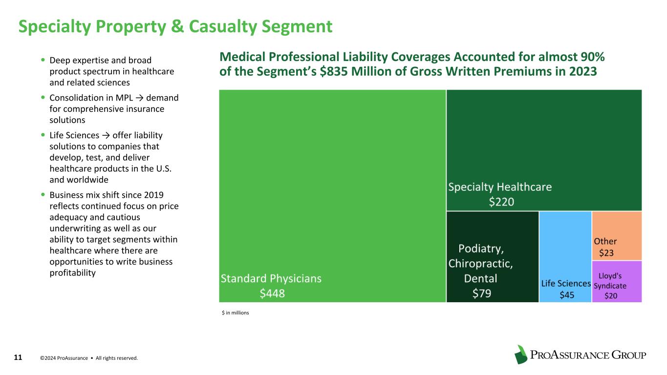©2024 ProAssurance • All rights reserved. 10 A Foundation in Excellence SUPERIOR BRAND IDENTITY AND REPUTATION IN THE MARKET SCOPE & SCALE Regional hubs combined with local knowledge of market dynamics and regulatory environments HISTORY OF SUCCESSFUL MERGERS & ACQUISITIONS Selective M&A with best-in-class partners, and nearly 20 transactions in our 47-year history EXPERIENCED & COLLABORATIVE LEADERSHIP Average executive leadership tenure of 20 years with PRA or subsidiaries SPECIALIZATION Deep expertise and commitment to our customers throughout the insurance cycles enable us to outperform our peers over time “Our long history in our markets makes us confident that the cyclical lines of insurance where we do business will respond to our focused efforts.” -Ned Rand, President & CEO