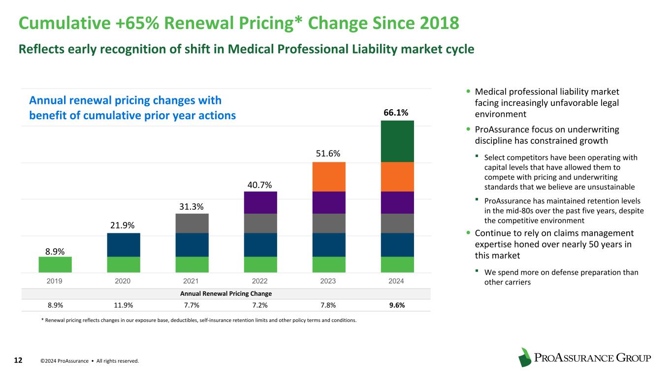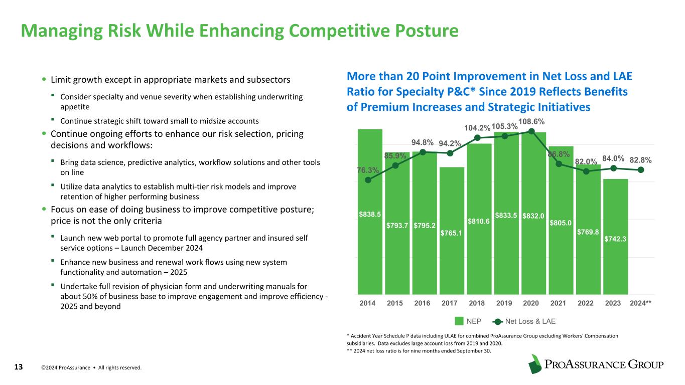 ©2024 ProAssurance • All rights reserved. 12 2019 2020 2021 2022 2023 2024 Cumulative +65% Renewal Pricing* Change Since 2018 • Medical professional liability market facing increasingly unfavorable legal environment • ProAssurance focus on underwriting discipline has constrained growth ▪ Select competitors have been operating with capital levels that have allowed them to compete with pricing and underwriting standards that we believe are unsustainable ▪ ProAssurance has maintained retention levels in the mid-80s over the past five years, despite the competitive environment • Continue to rely on claims management expertise honed over nearly 50 years in this market ▪ We spend more on defense preparation than other carriers Annual Renewal Pricing Change 8.9% 11.9% 7.7% 7.2% 7.8% 9.6% Reflects early recognition of shift in Medical Professional Liability market cycle Annual renewal pricing changes with benefit of cumulative prior year actions 8.9% 21.9% 31.3% 40.7% 51.6% 66.1% * Renewal pricing reflects changes in our exposure base, deductibles, self-insurance retention limits and other policy terms and conditions.