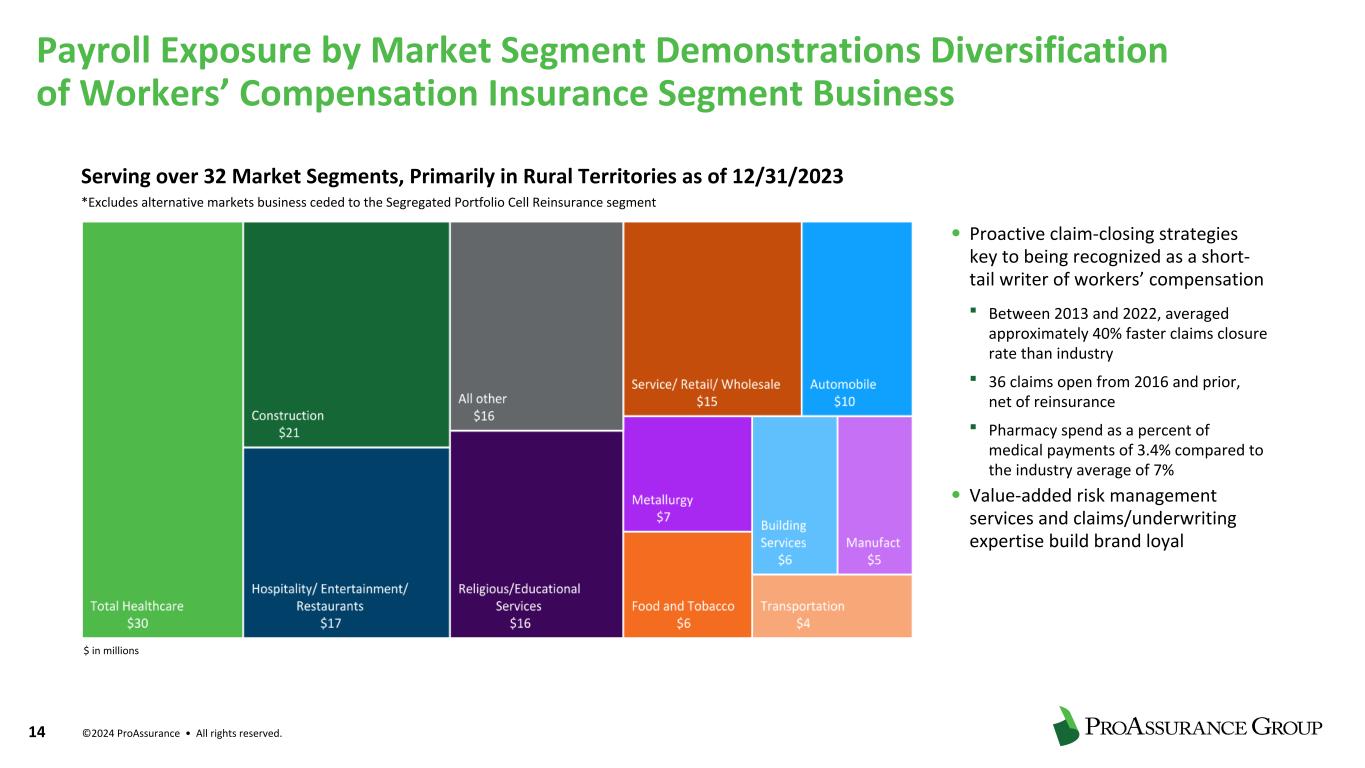 ©2024 ProAssurance • All rights reserved. 13 Managing Risk While Enhancing Competitive Posture • Limit growth except in appropriate markets and subsectors ▪ Consider specialty and venue severity when establishing underwriting appetite ▪ Continue strategic shift toward small to midsize accounts • Continue ongoing efforts to enhance our risk selection, pricing decisions and workflows: ▪ Bring data science, predictive analytics, workflow solutions and other tools on line ▪ Utilize data analytics to establish multi-tier risk models and improve retention of higher performing business • Focus on ease of doing business to improve competitive posture; price is not the only criteria ▪ Launch new web portal to promote full agency partner and insured self service options – Launch December 2024 ▪ Enhance new business and renewal work flows using new system functionality and automation – 2025 ▪ Undertake full revision of physician form and underwriting manuals for about 50% of business base to improve engagement and improve efficiency - 2025 and beyond $838.5 $793.7 $795.2 $765.1 $810.6 $833.5 $832.0 $805.0 $769.8 $742.3 76.3% 85.9% 94.8% 94.2% 104.2%105.3% 108.6% 86.8% 82.0% 84.0% 82.8% NEP Net Loss & LAE 2014 2015 2016 2017 2018 2019 2020 2021 2022 2023 2024** More than 20 Point Improvement in Net Loss and LAE Ratio for Specialty P&C* Since 2019 Reflects Benefits of Premium Increases and Strategic Initiatives * Accident Year Schedule P data including ULAE for combined ProAssurance Group excluding Workers' Compensation subsidiaries. Data excludes large account loss from 2019 and 2020. ** 2024 net loss ratio is for nine months ended September 30.