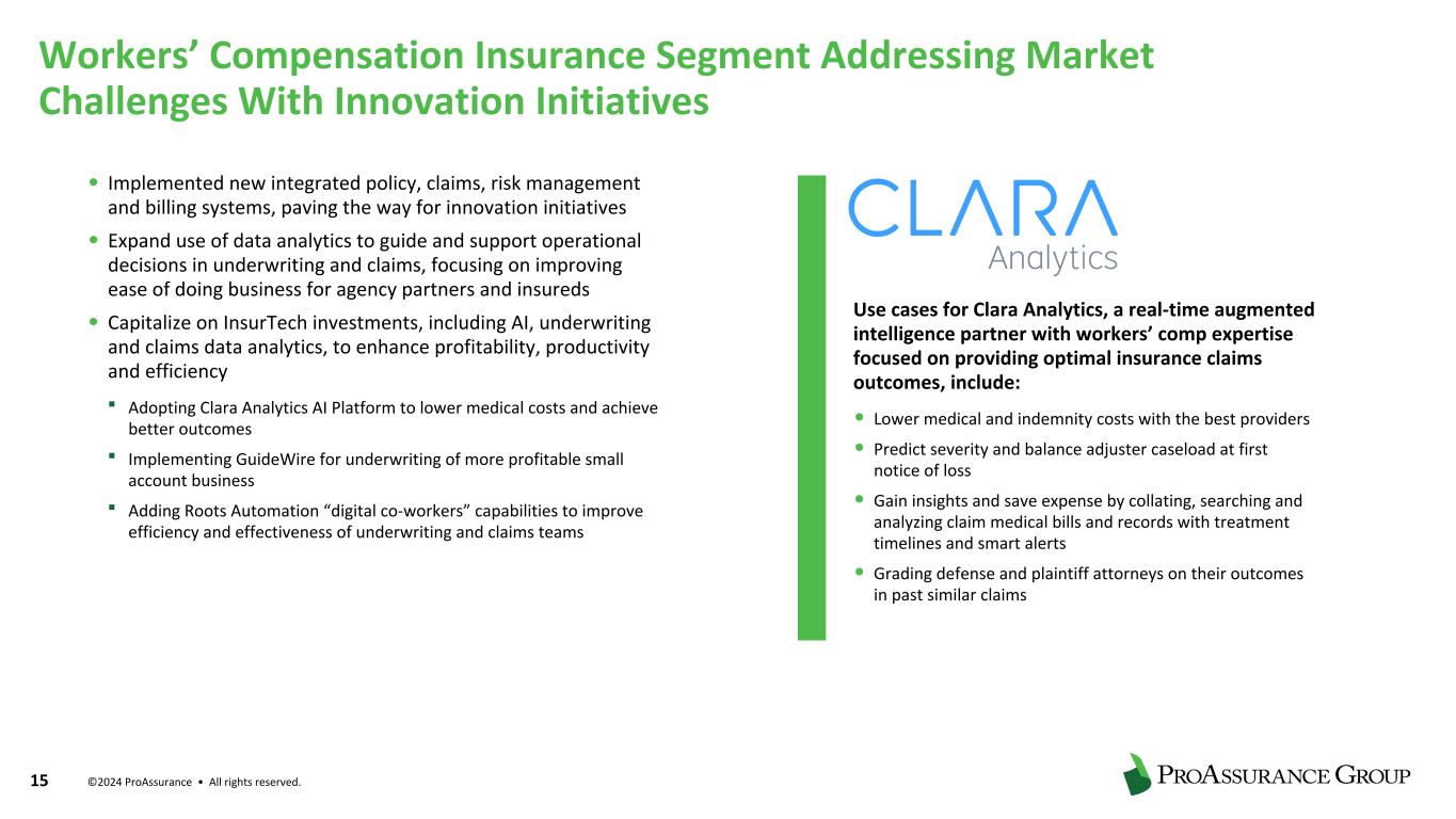 ©2024 ProAssurance • All rights reserved. 15 Workers’ Compensation Insurance Segment Addressing Market Challenges With Innovation Initiatives • Implemented new integrated policy, claims, risk management and billing systems, paving the way for innovation initiatives • Expand use of data analytics to guide and support operational decisions in underwriting and claims, focusing on improving ease of doing business for agency partners and insureds • Capitalize on InsurTech investments, including AI, underwriting and claims data analytics, to enhance profitability, productivity and efficiency ▪ Adopting Clara Analytics AI Platform to lower medical costs and achieve better outcomes ▪ Implementing GuideWire for underwriting of more profitable small account business ▪ Adding Roots Automation “digital co-workers” capabilities to improve efficiency and effectiveness of underwriting and claims teams Use cases for Clara Analytics, a real-time augmented intelligence partner with workers’ comp expertise focused on providing optimal insurance claims outcomes, include: • Lower medical and indemnity costs with the best providers • Predict severity and balance adjuster caseload at first notice of loss • Gain insights and save expense by collating, searching and analyzing claim medical bills and records with treatment timelines and smart alerts • Grading defense and plaintiff attorneys on their outcomes in past similar claims