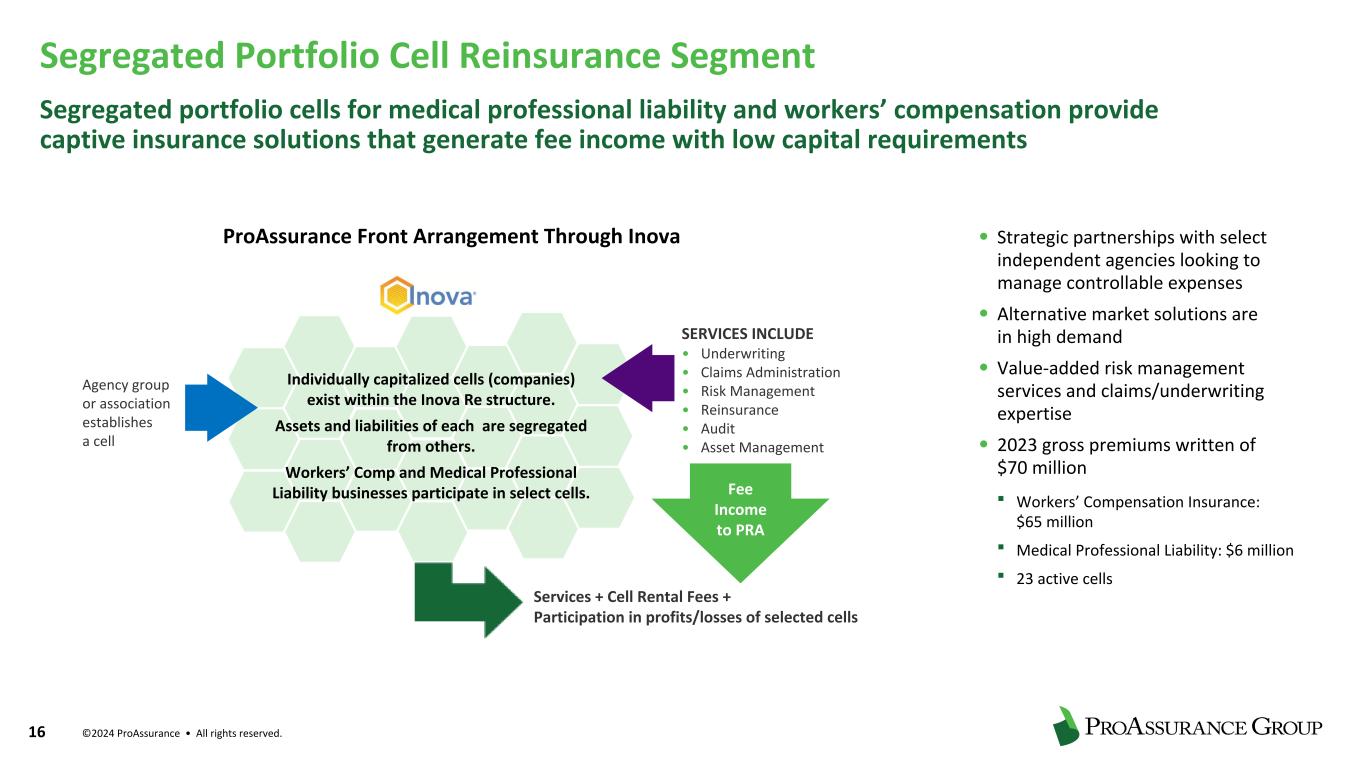 ©2024 ProAssurance • All rights reserved. 16 Agency group or association establishes a cell SERVICES INCLUDE • Underwriting • Claims Administration • Risk Management • Reinsurance • Audit • Asset Management Services + Cell Rental Fees + Participation in profits/losses of selected cells Fee Income to PRA • Strategic partnerships with select independent agencies looking to manage controllable expenses • Alternative market solutions are in high demand • Value-added risk management services and claims/underwriting expertise • 2023 gross premiums written of $70 million ▪ Workers’ Compensation Insurance: $65 million ▪ Medical Professional Liability: $6 million ▪ 23 active cells Individually capitalized cells (companies) exist within the Inova Re structure. Assets and liabilities of each are segregated from others. Workers’ Comp and Medical Professional Liability businesses participate in select cells. ProAssurance Front Arrangement Through Inova Segregated Portfolio Cell Reinsurance Segment Segregated portfolio cells for medical professional liability and workers’ compensation provide captive insurance solutions that generate fee income with low capital requirements