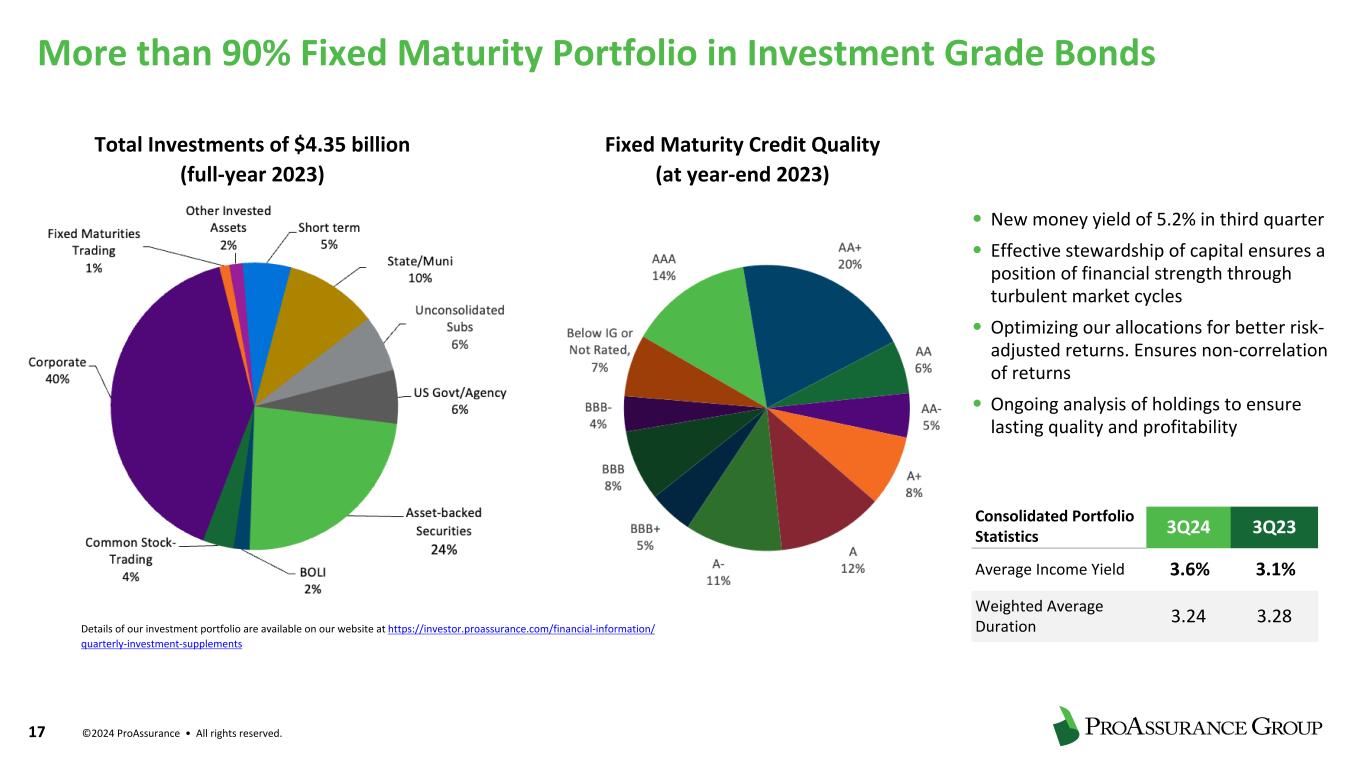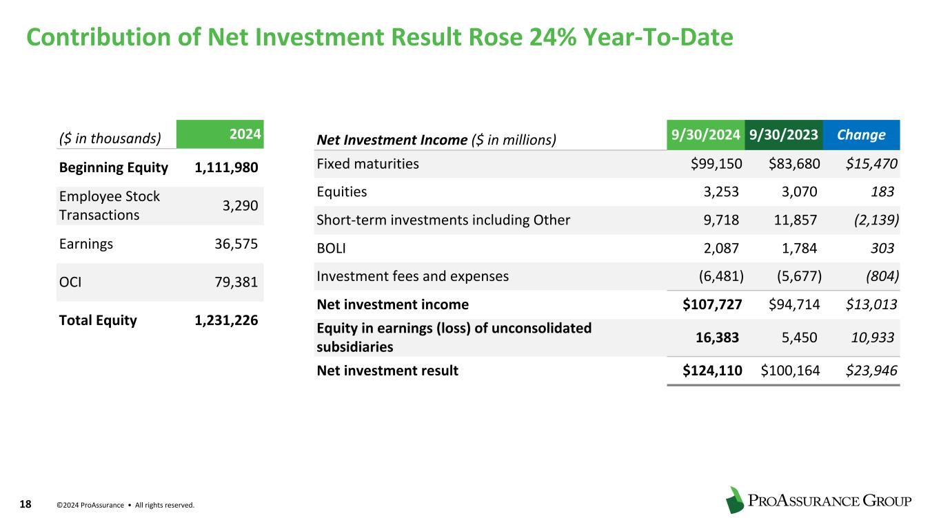 ©2024 ProAssurance • All rights reserved. 17 Details of our investment portfolio are available on our website at https://investor.proassurance.com/financial-information/ quarterly-investment-supplements More than 90% Fixed Maturity Portfolio in Investment Grade Bonds • New money yield of 5.2% in third quarter • Effective stewardship of capital ensures a position of financial strength through turbulent market cycles • Optimizing our allocations for better risk- adjusted returns. Ensures non-correlation of returns • Ongoing analysis of holdings to ensure lasting quality and profitability Total Investments of $4.35 billion (full-year 2023) Consolidated Portfolio Statistics 3Q24 3Q23 Average Income Yield 3.6% 3.1% Weighted Average Duration 3.24 3.28 Fixed Maturity Credit Quality (at year-end 2023)