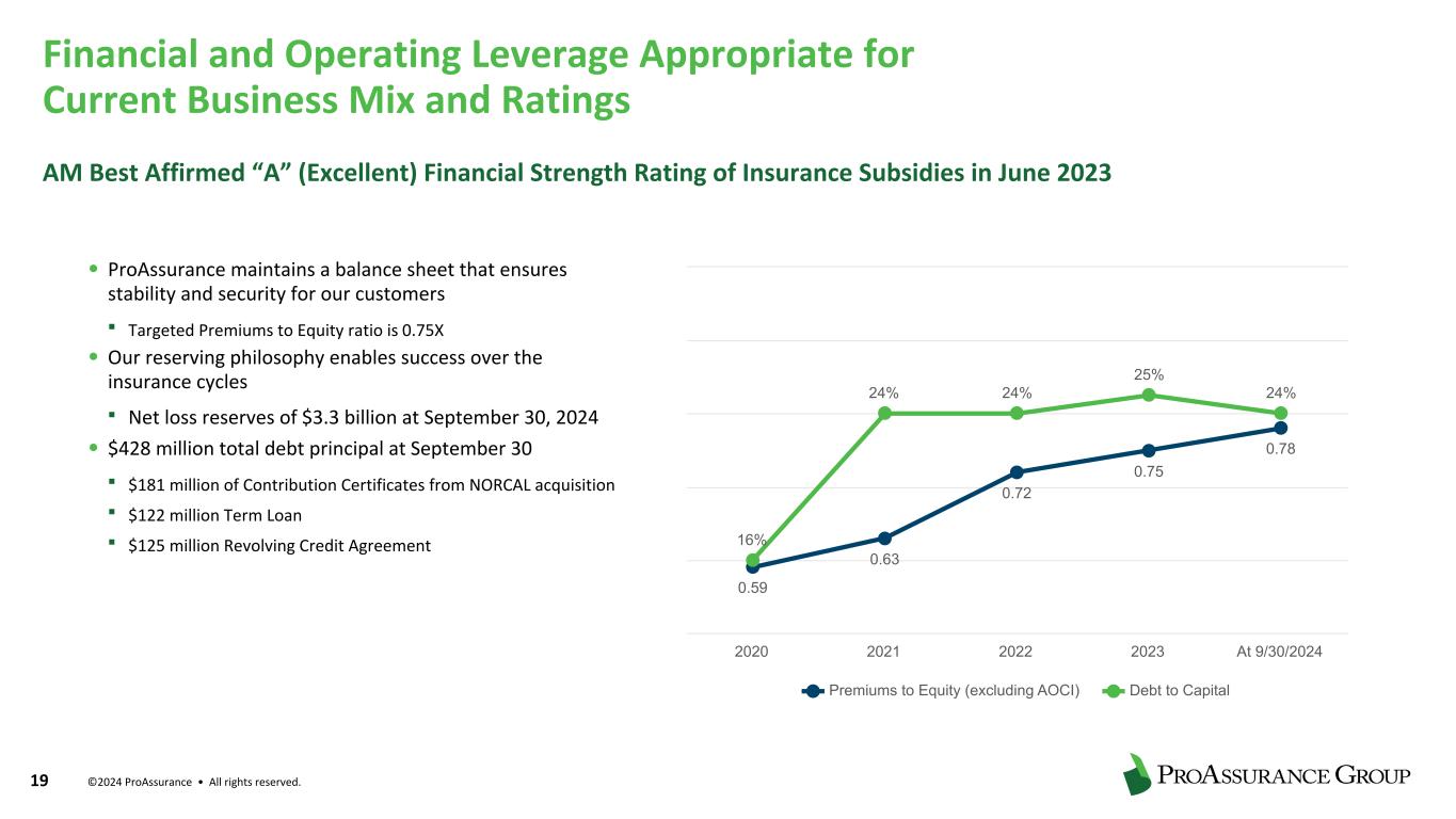 ©2024 ProAssurance • All rights reserved. 18 Contribution of Net Investment Result Rose 24% Year-To-Date ($ in thousands) 2024 Beginning Equity 1,111,980 Employee Stock Transactions 3,290 Earnings 36,575 OCI 79,381 Total Equity 1,231,226 Net Investment Income ($ in millions) 9/30/2024 9/30/2023 Change Fixed maturities $99,150 $83,680 $15,470 Equities 3,253 3,070 183 Short-term investments including Other 9,718 11,857 (2,139) BOLI 2,087 1,784 303 Investment fees and expenses (6,481) (5,677) (804) Net investment income $107,727 $94,714 $13,013 Equity in earnings (loss) of unconsolidated subsidiaries 16,383 5,450 10,933 Net investment result $124,110 $100,164 $23,946