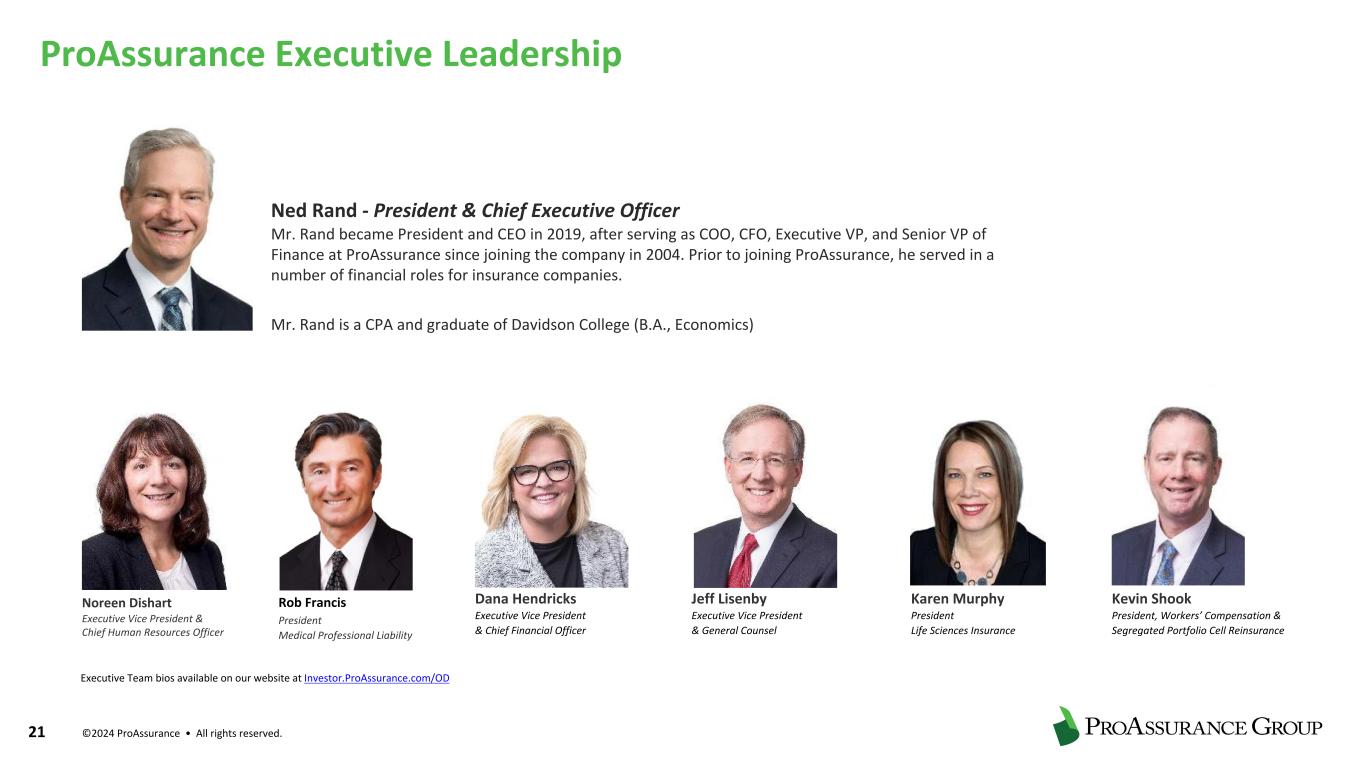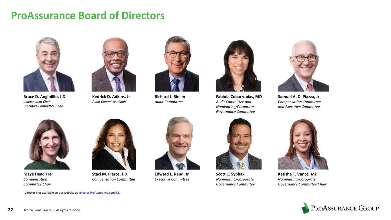 ©2024 ProAssurance • All rights reserved. 21 ProAssurance Executive Leadership Executive Team bios available on our website at Investor.ProAssurance.com/OD Ned Rand - President & Chief Executive Officer Mr. Rand became President and CEO in 2019, after serving as COO, CFO, Executive VP, and Senior VP of Finance at ProAssurance since joining the company in 2004. Prior to joining ProAssurance, he served in a number of financial roles for insurance companies. Mr. Rand is a CPA and graduate of Davidson College (B.A., Economics) Dana Hendricks Executive Vice President & Chief Financial Officer Jeff Lisenby Executive Vice President & General Counsel Rob Francis President Medical Professional Liability Kevin Shook President, Workers’ Compensation & Segregated Portfolio Cell Reinsurance Karen Murphy President Life Sciences Insurance Noreen Dishart Executive Vice President & Chief Human Resources Officer
