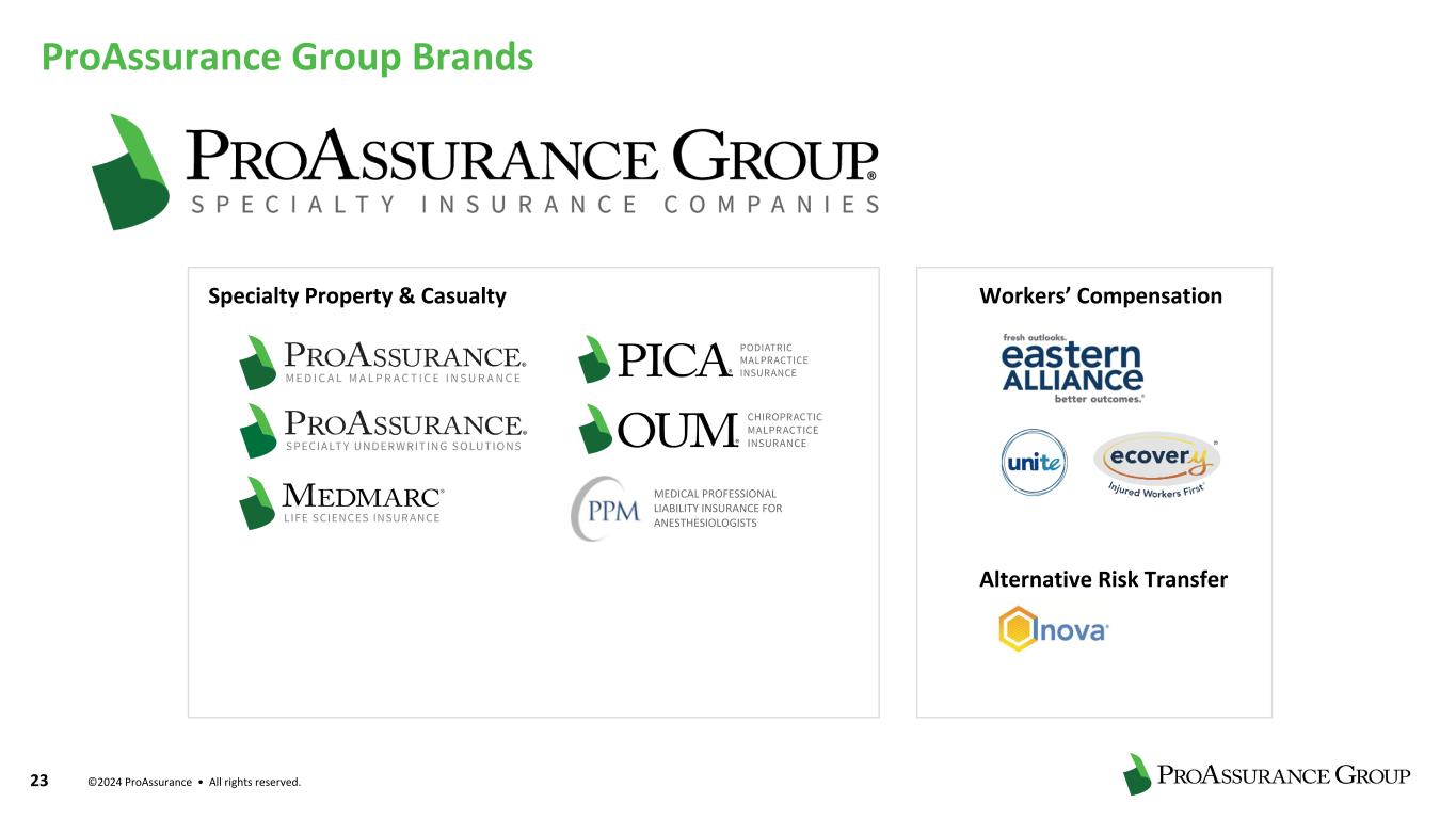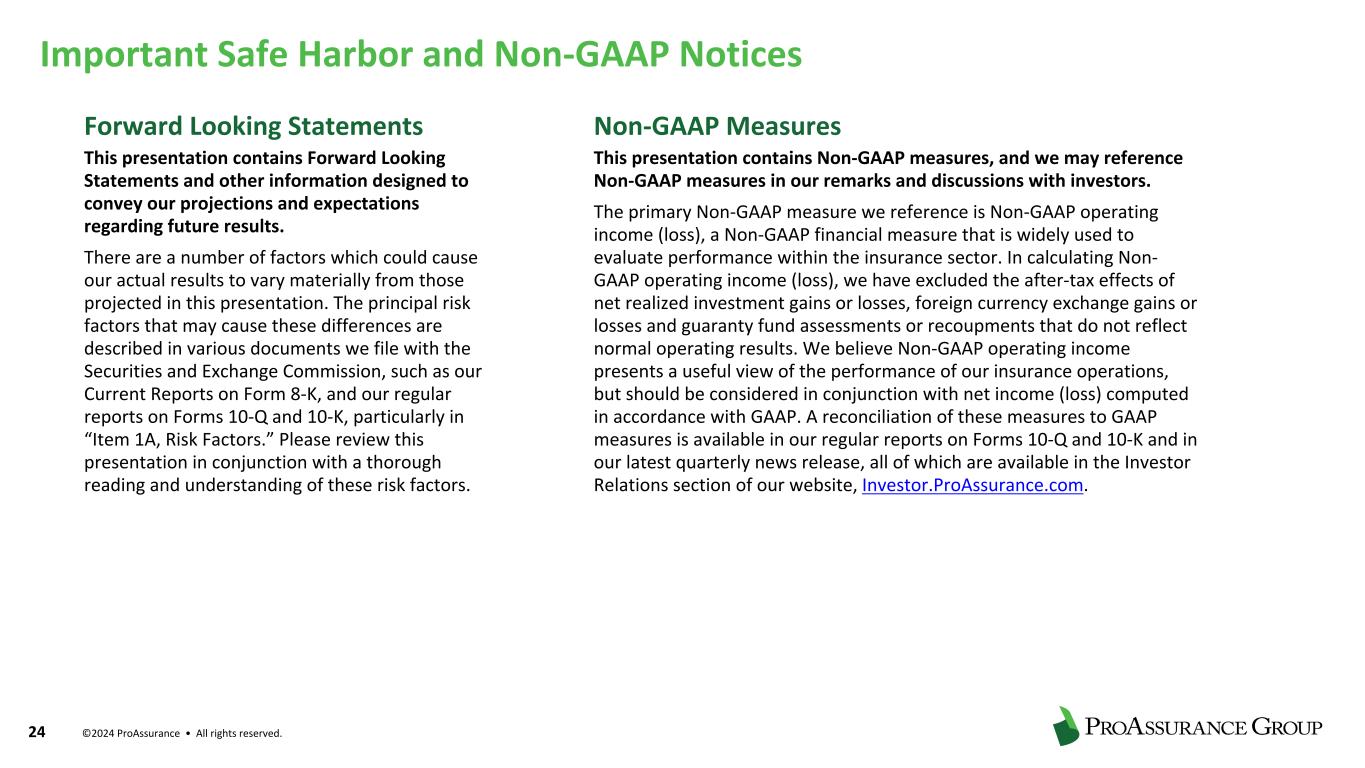 ©2024 ProAssurance • All rights reserved. 24 Forward Looking Statements This presentation contains Forward Looking Statements and other information designed to convey our projections and expectations regarding future results. There are a number of factors which could cause our actual results to vary materially from those projected in this presentation. The principal risk factors that may cause these differences are described in various documents we file with the Securities and Exchange Commission, such as our Current Reports on Form 8-K, and our regular reports on Forms 10-Q and 10-K, particularly in “Item 1A, Risk Factors.” Please review this presentation in conjunction with a thorough reading and understanding of these risk factors. Non-GAAP Measures This presentation contains Non-GAAP measures, and we may reference Non-GAAP measures in our remarks and discussions with investors. The primary Non-GAAP measure we reference is Non-GAAP operating income (loss), a Non-GAAP financial measure that is widely used to evaluate performance within the insurance sector. In calculating Non- GAAP operating income (loss), we have excluded the after-tax effects of net realized investment gains or losses, foreign currency exchange gains or losses and guaranty fund assessments or recoupments that do not reflect normal operating results. We believe Non-GAAP operating income presents a useful view of the performance of our insurance operations, but should be considered in conjunction with net income (loss) computed in accordance with GAAP. A reconciliation of these measures to GAAP measures is available in our regular reports on Forms 10-Q and 10-K and in our latest quarterly news release, all of which are available in the Investor Relations section of our website, Investor.ProAssurance.com. Important Safe Harbor and Non-GAAP Notices