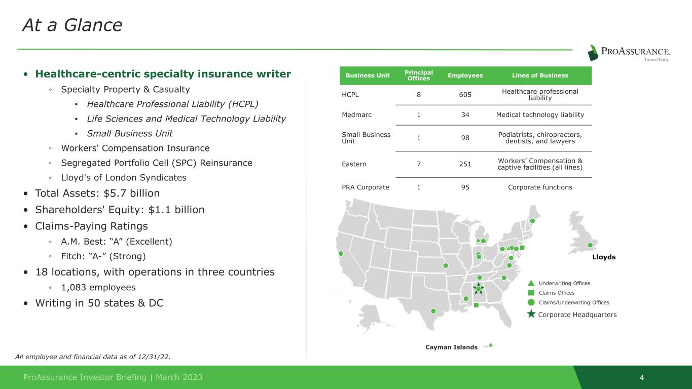 ProAssurance Investor Briefing | March 2023 3 Mission, Vision, & Values The ProAssurance Mission We Protect Others. Corporate Values Integrity | Leadership | Relationships | Enthusiasm Our Brand Promise We will honor these values in the execution of treated fairly to perform our mission and realize our vision.
