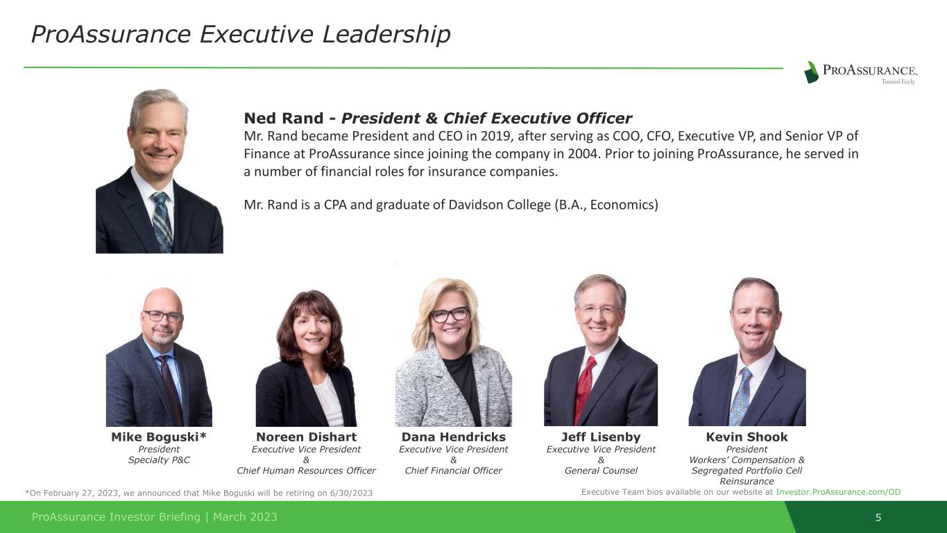 ProAssurance Investor Briefing | March 2023 4 At a Glance All employee and financial data as of 12/31/22. Business Unit Principal Offices Employees Lines of Business HCPL 8 605 Healthcare professional liability Medmarc 1 34 Medical technology liability Small Business Unit 1 98 Podiatrists, chiropractors, dentists, and lawyers Eastern 7 251 Workers’ Compensation & captive facilities (all lines) PRA Corporate 1 95 Corporate functions • Healthcare-centric specialty insurance writer ◦ Specialty Property & Casualty ▪ Healthcare Professional Liability (HCPL) ▪ Life Sciences and Medical Technology Liability ▪ Small Business Unit ◦ Workers' Compensation Insurance ◦ Segregated Portfolio Cell (SPC) Reinsurance ◦ Lloyd's of London Syndicates • Total Assets: $5.7 billion • Shareholders' Equity: $1.1 billion • Claims-Paying Ratings ◦ A.M. Best: “A” (Excellent) ◦ Fitch: “A-” (Strong) • 18 locations, with operations in three countries ◦ 1,083 employees • Writing in 50 states & DC Corporate Headquarters Claims Offices Claims/Underwriting Offices Underwriting Offices Cayman Islands Lloyds