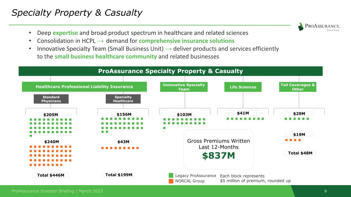 ProAssurance Investor Briefing | March 2023 8 ProAssurance Specialty Property & Casualty • Healthcare Professional Liability (HCPL) insures healthcare providers and facilities, including E&S coverages • The Small Business Unit insures podiatrists, chiropractors, dentists, and lawyers • Medmarc insures medical technology and life sciences companies that manufacture or distribute products Eastern Alliance Workers’ Compensation • Specialty underwriter of workers’ compensation products and services • Focused in the East, South, and Midwest regions of the United States • Guaranteed cost, policyholder dividend, retro-rated, deductible, and alternative solutions policies available Inova Re/Eastern Re SPC Reinsurance • Segregated Portfolio Company structure • Workers’ compensation and healthcare professional liability coverage in a Cayman-based captive • Industries include healthcare, forestry, staffing, construction, petroleum, marine and recreation, and social services Lloyd’s Syndicates • The results from our participation in Lloyd's of London Syndicates. Participation has been reduced to 5% of one syndicate (1729) in the past two years. ProAssurance Corporate • Reports our investment results, interest expense, and U.S. income taxes • Includes corporate expenses and includes non-premium revenues generated outside of our insurance entities • Company-wide administrative departments reside in ProAssurance Corporate ProAssurance Reports Financial Results in Five Segments