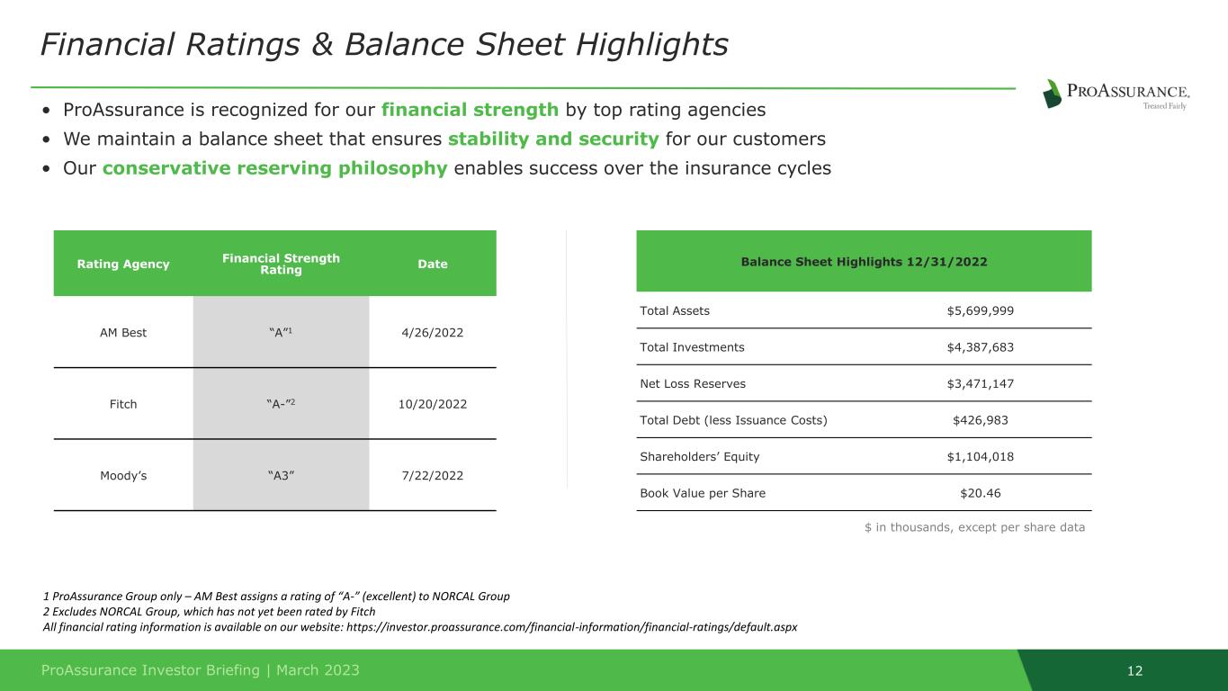 ProAssurance Investor Briefing | March 2023 11 Segregated Portfolio Cell Reinsurance ProAssurance Fronting Arrangement Agency Group or Association establishes a cell Underwriting Claims Administration Risk Management Reinsurance Audit Asset Management Services + Cell Rental Fees + Participation in profits/losses of selected cells Fee Income to PRA • HCPL and workers’ compensation captive insurance solutions through Inova Re (Cayman Islands) • SPCs are a high ROE product with favorable retention results • Low capital requirement • Strategic partnerships with select independent agencies looking to manage controllable expenses • Alternative market solutions are in high demand • Value-added risk management services and claims/underwriting expertise Inova Re Services As of 12/31/2022 • Gross premiums written YTD: $79M o Workers’ Compensation Insurance: $68M o Healthcare Professional Liability: $11M • 25 active cells Individually capitalized cells (companies) exist within the Inova Re structure. Assets of each are segregated from others. ProAssurance/Eastern participates in select cells