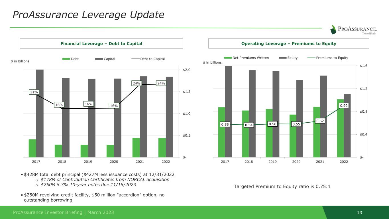 ProAssurance Investor Briefing | March 2023 13 • $428M total debt principal ($427M less issuance costs) at 12/31/2022 o $178M of Contribution Certificates from NORCAL acquisition o $250M 5.3% 10-year notes due 11/15/2023 • $250M revolving credit facility, $50 million "accordion" option, no outstanding borrowing ProAssurance Leverage Update Targeted Premium to Equity ratio is 0.75:1 Financial Leverage – Debt to Capital Operating Leverage – Premiums to Equity 21% 16% 16% 16% 24% 24% $- $0.5 $1.0 $1.5 $2.0 2017 2018 2019 2020 2021 2022 $ in billions Debt Capital Debt to Capital 0.55 0.54 0.56 0.55 0.62 0.92 $- $0.4 $0.8 $1.2 $1.6 2017 2018 2019 2020 2021 2022 $ in billions Net Premiums Written Equity Premiums to Equity