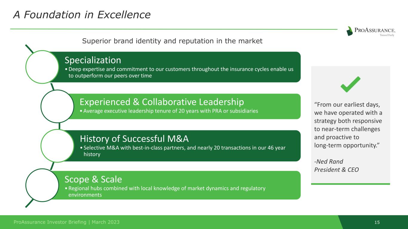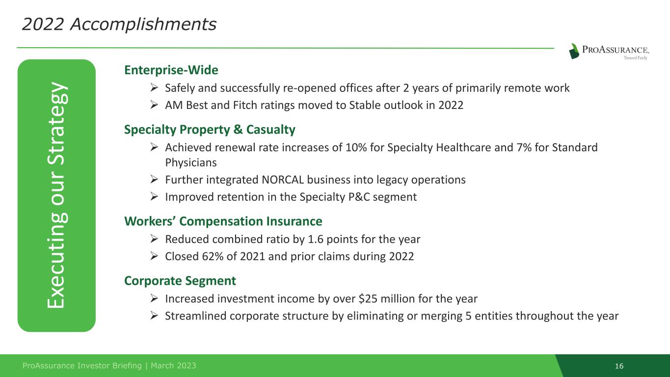 ProAssurance Investor Briefing | March 2023 15 A Foundation in Excellence “From our earliest days, we have operated with a strategy both responsive to near-term challenges and proactive to long-term opportunity.” -Ned Rand President & CEO Superior brand identity and reputation in the market Specialization • Deep expertise and commitment to our customers throughout the insurance cycles enable us to outperform our peers over time Experienced & Collaborative Leadership • Average executive leadership tenure of 20 years with PRA or subsidiaries History of Successful M&A • Selective M&A with best-in-class partners, and nearly 20 transactions in our 46 year history Scope & Scale • Regional hubs combined with local knowledge of market dynamics and regulatory environments