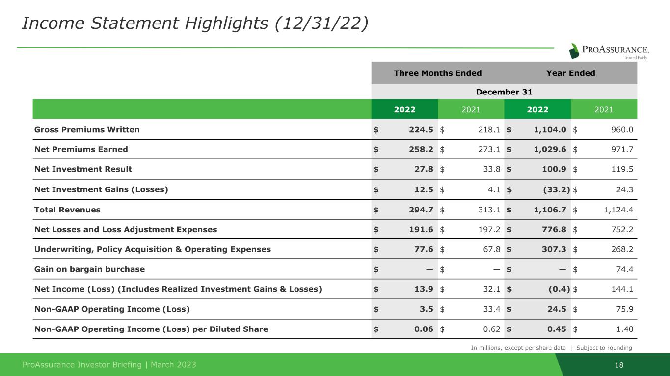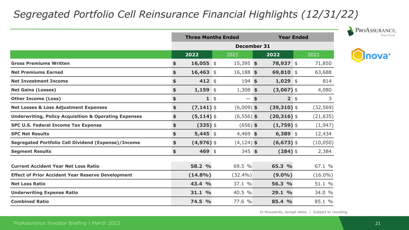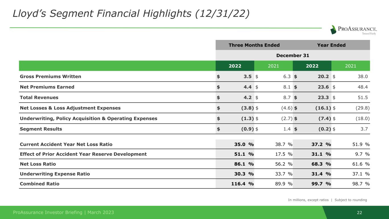 ProAssurance Investor Briefing | March 2023 21 Segregated Portfolio Cell Reinsurance Financial Highlights (12/31/22) Three Months Ended Year Ended December 31 2022 2021 2022 2021 Gross Premiums Written $ 16,055 $ 15,395 $ 78,937 $ 71,850 Net Premiums Earned $ 16,463 $ 16,188 $ 69,810 $ 63,688 Net Investment Income $ 412 $ 194 $ 1,029 $ 814 Net Gains (Losses) $ 1,159 $ 1,308 $ (3,067) $ 4,080 Other Income (Loss) $ 1 $ — $ 2 $ 3 Net Losses & Loss Adjustment Expenses $ (7,141) $ (6,009) $ (39,310) $ (32,569) Underwriting, Policy Acquisition & Operating Expenses $ (5,114) $ (6,556) $ (20,316) $ (21,635) SPC U.S. Federal Income Tax Expense $ (335) $ (656) $ (1,759) $ (1,947) SPC Net Results $ 5,445 $ 4,469 $ 6,389 $ 12,434 Segregated Portfolio Cell Dividend (Expense)/Income $ (4,976) $ (4,124) $ (6,673) $ (10,050) Segment Results $ 469 $ 345 $ (284) $ 2,384 In thousands, except ratios | Subject to rounding Current Accident Year Net Loss Ratio 58.2 % 69.5 % 65.3 % 67.1 % Effect of Prior Accident Year Reserve Development (14.8%) (32.4%) (9.0%) (16.0%) Net Loss Ratio 43.4 % 37.1 % 56.3 % 51.1 % Underwriting Expense Ratio 31.1 % 40.5 % 29.1 % 34.0 % Combined Ratio 74.5 % 77.6 % 85.4 % 85.1 %