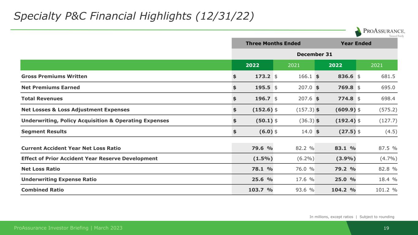 ProAssurance Investor Briefing | March 2023 18 Income Statement Highlights (12/31/22) Three Months Ended Year Ended December 31 2022 2021 2022 2021 Gross Premiums Written $ 224.5 $ 218.1 $ 1,104.0 $ 960.0 Net Premiums Earned $ 258.2 $ 273.1 $ 1,029.6 $ 971.7 Net Investment Result $ 27.8 $ 33.8 $ 100.9 $ 119.5 Net Investment Gains (Losses) $ 12.5 $ 4.1 $ (33.2) $ 24.3 Total Revenues $ 294.7 $ 313.1 $ 1,106.7 $ 1,124.4 Net Losses and Loss Adjustment Expenses $ 191.6 $ 197.2 $ 776.8 $ 752.2 Underwriting, Policy Acquisition & Operating Expenses $ 77.6 $ 67.8 $ 307.3 $ 268.2 Gain on bargain burchase $ — $ — $ — $ 74.4 Net Income (Loss) (Includes Realized Investment Gains & Losses) $ 13.9 $ 32.1 $ (0.4) $ 144.1 Non-GAAP Operating Income (Loss) $ 3.5 $ 33.4 $ 24.5 $ 75.9 Non-GAAP Operating Income (Loss) per Diluted Share $ 0.06 $ 0.62 $ 0.45 $ 1.40 In millions, except per share data | Subject to rounding
