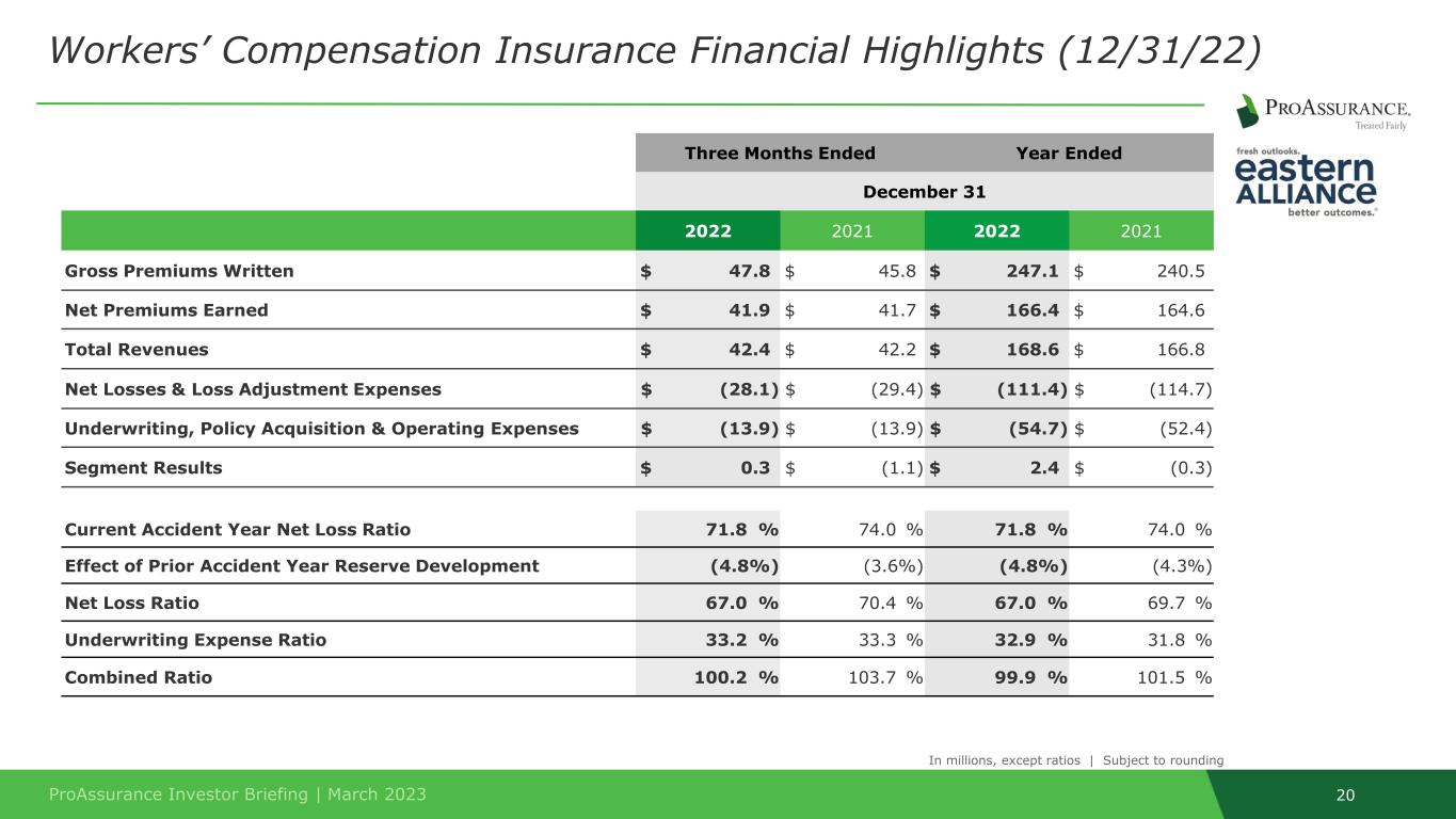 ProAssurance Investor Briefing | March 2023 19 Current Accident Year Net Loss Ratio 79.6 % 82.2 % 83.1 % 87.5 % Effect of Prior Accident Year Reserve Development (1.5%) (6.2%) (3.9%) (4.7%) Net Loss Ratio 78.1 % 76.0 % 79.2 % 82.8 % Underwriting Expense Ratio 25.6 % 17.6 % 25.0 % 18.4 % Combined Ratio 103.7 % 93.6 % 104.2 % 101.2 % Specialty P&C Financial Highlights (12/31/22) Three Months Ended Year Ended December 31 2022 2021 2022 2021 Gross Premiums Written $ 173.2 $ 166.1 $ 836.6 $ 681.5 Net Premiums Earned $ 195.5 $ 207.0 $ 769.8 $ 695.0 Total Revenues $ 196.7 $ 207.6 $ 774.8 $ 698.4 Net Losses & Loss Adjustment Expenses $ (152.6) $ (157.3) $ (609.9) $ (575.2) Underwriting, Policy Acquisition & Operating Expenses $ (50.1) $ (36.3) $ (192.4) $ (127.7) Segment Results $ (6.0) $ 14.0 $ (27.5) $ (4.5) In millions, except ratios | Subject to rounding