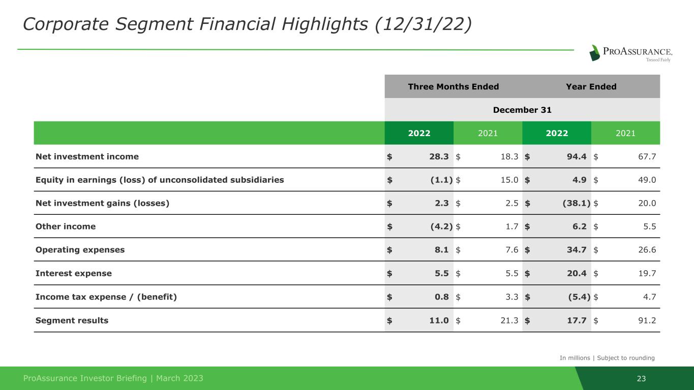 ProAssurance Investor Briefing | March 2023 22 Lloyd’s Segment Financial Highlights (12/31/22) Three Months Ended Year Ended December 31 2022 2021 2022 2021 Gross Premiums Written $ 3.5 $ 6.3 $ 20.2 $ 38.0 Net Premiums Earned $ 4.4 $ 8.1 $ 23.6 $ 48.4 Total Revenues $ 4.2 $ 8.7 $ 23.3 $ 51.5 Net Losses & Loss Adjustment Expenses $ (3.8) $ (4.6) $ (16.1) $ (29.8) Underwriting, Policy Acquisition & Operating Expenses $ (1.3) $ (2.7) $ (7.4) $ (18.0) Segment Results $ (0.9) $ 1.4 $ (0.2) $ 3.7 Current Accident Year Net Loss Ratio 35.0 % 38.7 % 37.2 % 51.9 % Effect of Prior Accident Year Reserve Development 51.1 % 17.5 % 31.1 % 9.7 % Net Loss Ratio 86.1 % 56.2 % 68.3 % 61.6 % Underwriting Expense Ratio 30.3 % 33.7 % 31.4 % 37.1 % Combined Ratio 116.4 % 89.9 % 99.7 % 98.7 % In millions, except ratios | Subject to rounding