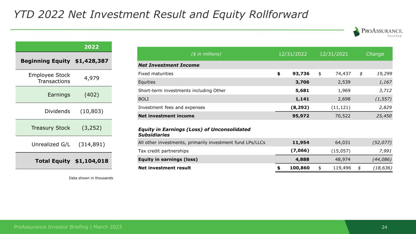 ProAssurance Investor Briefing | March 2023 23 Corporate Segment Financial Highlights (12/31/22) Three Months Ended Year Ended December 31 2022 2021 2022 2021 Net investment income $ 28.3 $ 18.3 $ 94.4 $ 67.7 Equity in earnings (loss) of unconsolidated subsidiaries $ (1.1) $ 15.0 $ 4.9 $ 49.0 Net investment gains (losses) $ 2.3 $ 2.5 $ (38.1) $ 20.0 Other income $ (4.2) $ 1.7 $ 6.2 $ 5.5 Operating expenses $ 8.1 $ 7.6 $ 34.7 $ 26.6 Interest expense $ 5.5 $ 5.5 $ 20.4 $ 19.7 Income tax expense / (benefit) $ 0.8 $ 3.3 $ (5.4) $ 4.7 Segment results $ 11.0 $ 21.3 $ 17.7 $ 91.2 In millions | Subject to rounding