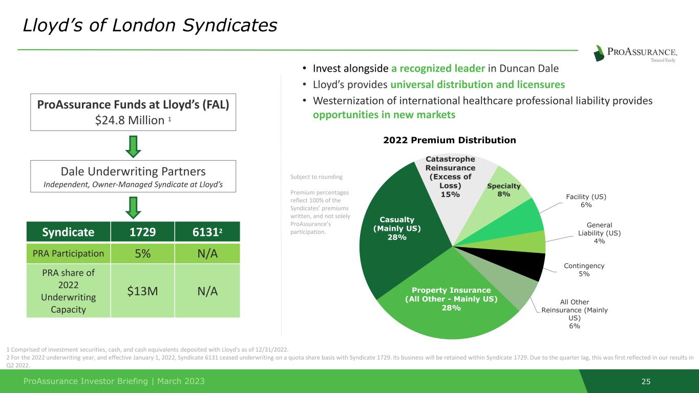 ProAssurance Investor Briefing | March 2023 24 YTD 2022 Net Investment Result and Equity Rollforward Data shown in thousands ($ in millions) 12/31/2022 12/31/2021 Change Net Investment Income Fixed maturities $ 93,736 $ 74,437 $ 19,299 Equities 3,706 2,539 1,167 Short-term investments including Other 5,681 1,969 3,712 BOLI 1,141 2,698 (1,557) Investment fees and expenses (8,292) (11,121) 2,829 Net investment income 95,972 70,522 25,450 Equity in Earnings (Loss) of Unconsolidated Subsidiaries All other investments, primarily investment fund LPs/LLCs 11,954 64,031 (52,077) Tax credit partnerships (7,066) (15,057) 7,991 Equity in earnings (loss) 4,888 48,974 (44,086) Net investment result $ 100,860 $ 119,496 $ (18,636) 2022 Beginning Equity $1,428,387 Employee Stock Transactions 4,979 Earnings (402) Dividends (10,803) Treasury Stock (3,252) Unrealized G/L (314,891) Total Equity $1,104,018