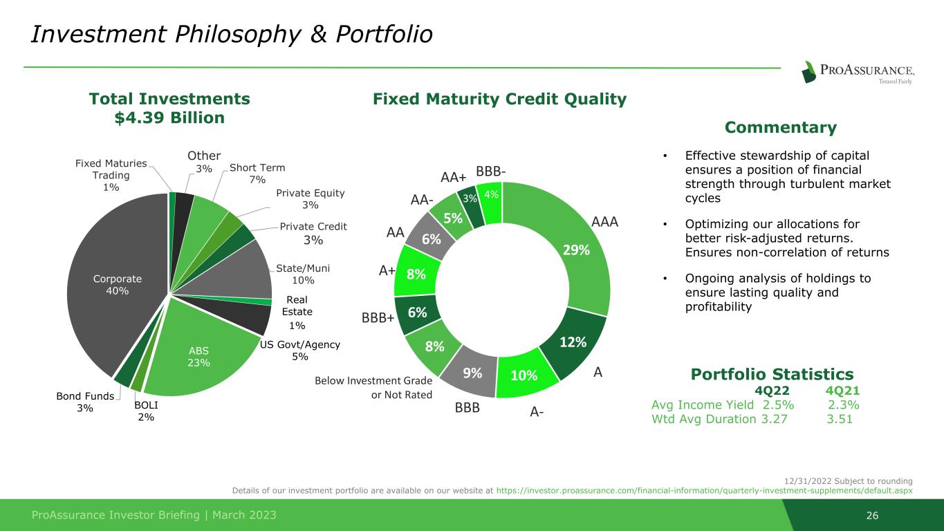 ProAssurance Investor Briefing | March 2023 25 Lloyd’s of London Syndicates ProAssurance Funds at Lloyd’s (FAL) $24.8 Million 1 Property Insurance (All Other - Mainly US) 28% Casualty (Mainly US) 28% Catastrophe Reinsurance (Excess of Loss) 15% Specialty 8% Facility (US) 6% General Liability (US) 4% Contingency 5% All Other Reinsurance (Mainly US) 6% 2022 Premium Distribution Dale Underwriting Partners Independent, Owner-Managed Syndicate at Lloyd’s Syndicate 1729 61312 PRA Participation 5% N/A PRA share of 2022 Underwriting Capacity $13M N/A • Invest alongside a recognized leader in Duncan Dale • Lloyd’s provides universal distribution and licensures • Westernization of international healthcare professional liability provides opportunities in new markets 1 Comprised of investment securities, cash, and cash equivalents deposited with Lloyd's as of 12/31/2022. 2 For the 2022 underwriting year, and effective January 1, 2022, Syndicate 6131 ceased underwriting on a quota share basis with Syndicate 1729. Its business will be retained within Syndicate 1729. Due to the quarter lag, this was first reflected in our results in Q2 2022. Subject to rounding Premium percentages reflect 100% of the Syndicates’ premiums written, and not solely ProAssurance’s participation.