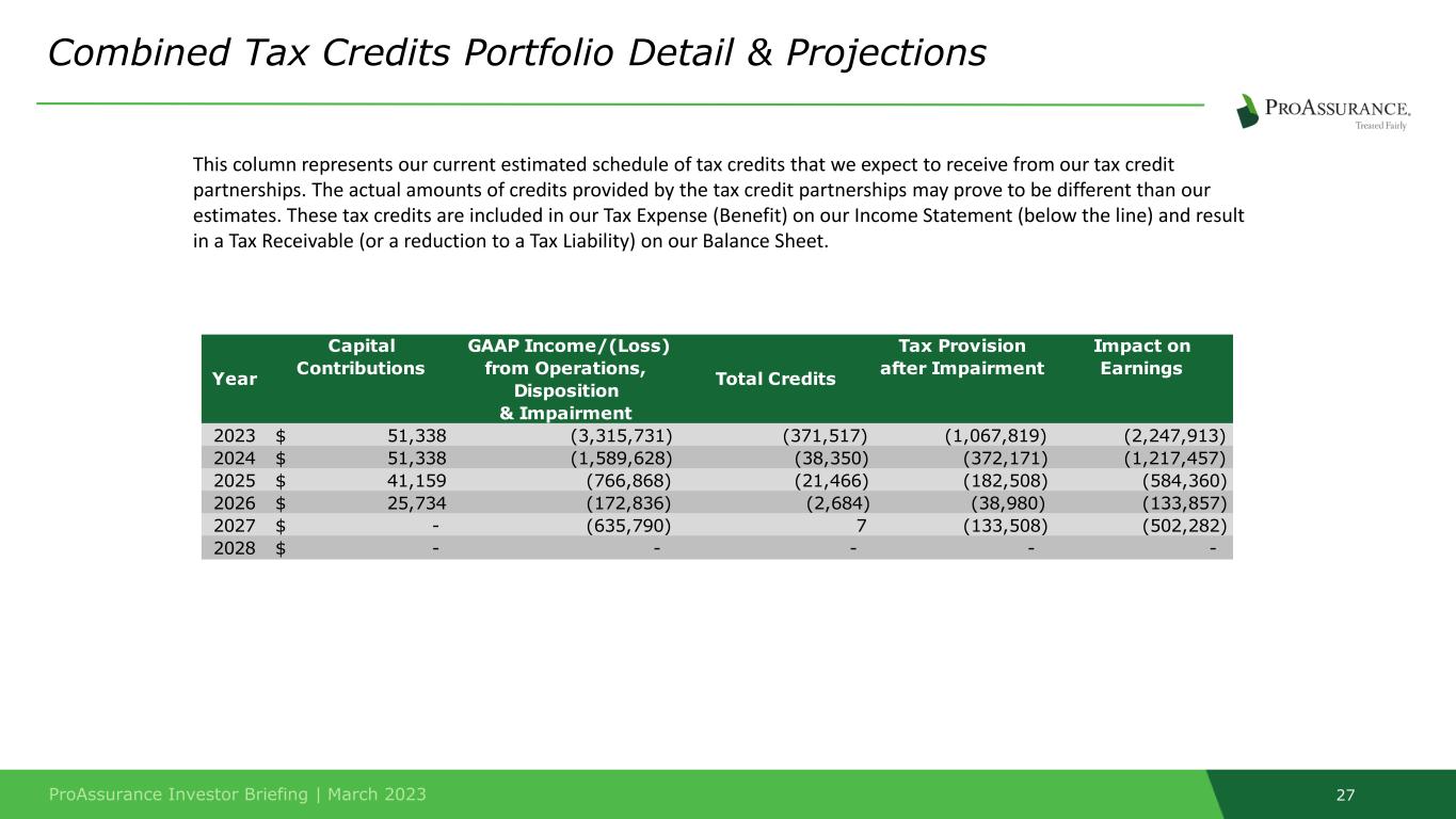 ProAssurance Investor Briefing | March 2023 27 Combined Tax Credits Portfolio Detail & Projections This column represents our current estimated schedule of tax credits that we expect to receive from our tax credit partnerships. The actual amounts of credits provided by the tax credit partnerships may prove to be different than our estimates. These tax credits are included in our Tax Expense (Benefit) on our Income Statement (below the line) and result in a Tax Receivable (or a reduction to a Tax Liability) on our Balance Sheet. GAAP Income/(Loss) Tax Provision Impact on from Operations, after Impairment Earnings Disposition & Impairment 2023 $ 51,338 (3,315,731) (371,517) (1,067,819) (2,247,913) 2024 $ 51,338 (1,589,628) (38,350) (372,171) (1,217,457) 2025 $ 41,159 (766,868) (21,466) (182,508) (584,360) 2026 $ 25,734 (172,836) (2,684) (38,980) (133,857) 2027 $ - (635,790) 7 (133,508) (502,282) 2028 $ - - - - - Year Capital Total Credits Contributions