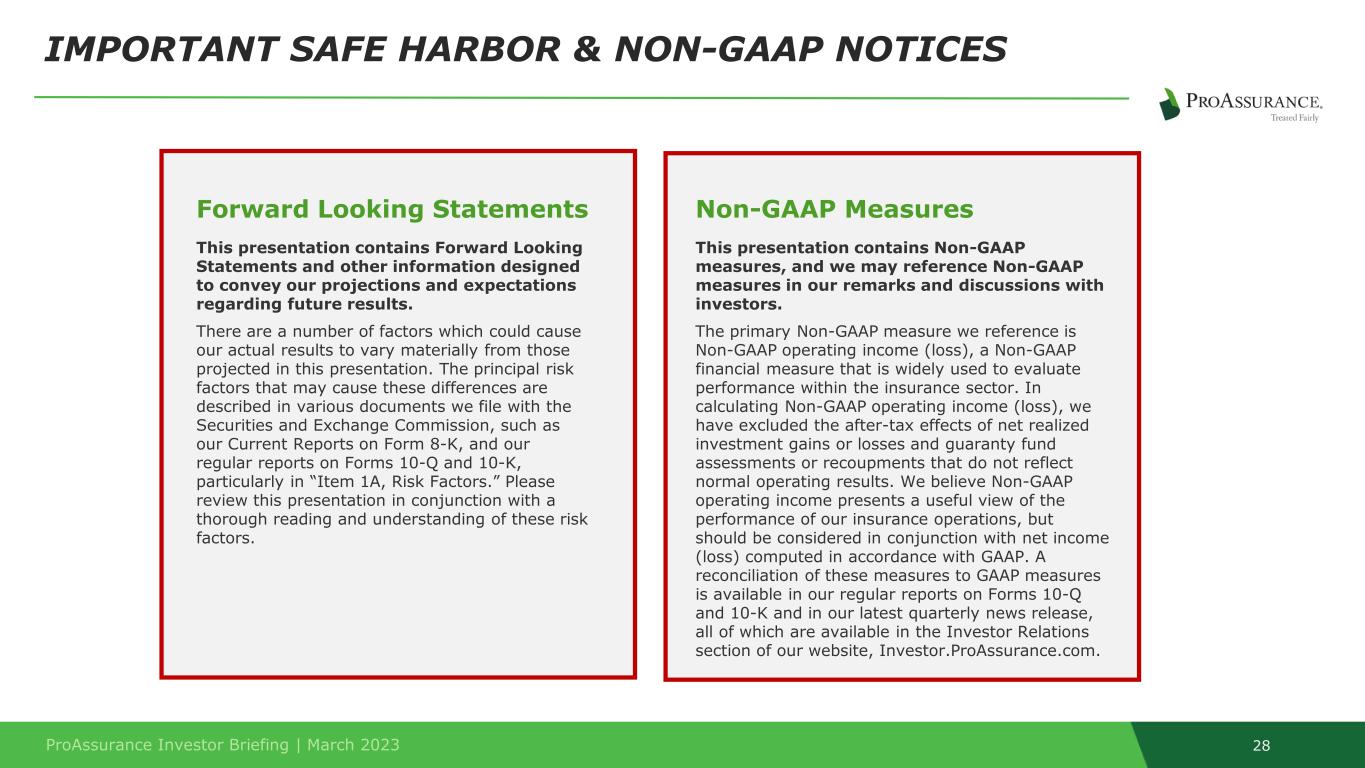ProAssurance Investor Briefing | March 2023 28 Forward Looking Statements Non-GAAP Measures This presentation contains Forward Looking Statements and other information designed to convey our projections and expectations regarding future results. There are a number of factors which could cause our actual results to vary materially from those projected in this presentation. The principal risk factors that may cause these differences are described in various documents we file with the Securities and Exchange Commission, such as our Current Reports on Form 8-K, and our regular reports on Forms 10-Q and 10-K, particularly in “Item 1A, Risk Factors.” Please review this presentation in conjunction with a thorough reading and understanding of these risk factors. This presentation contains Non-GAAP measures, and we may reference Non-GAAP measures in our remarks and discussions with investors. The primary Non-GAAP measure we reference is Non-GAAP operating income (loss), a Non-GAAP financial measure that is widely used to evaluate performance within the insurance sector. In calculating Non-GAAP operating income (loss), we have excluded the after-tax effects of net realized investment gains or losses and guaranty fund assessments or recoupments that do not reflect normal operating results. We believe Non-GAAP operating income presents a useful view of the performance of our insurance operations, but should be considered in conjunction with net income (loss) computed in accordance with GAAP. A reconciliation of these measures to GAAP measures is available in our regular reports on Forms 10-Q and 10-K and in our latest quarterly news release, all of which are available in the Investor Relations section of our website, Investor.ProAssurance.com. IMPORTANT SAFE HARBOR & NON-GAAP NOTICES