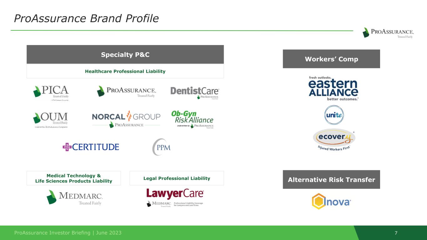 ProAssurance Investor Briefing | June 2023 6 ProAssurance Board of Directors Director bios available on our website at Investor.ProAssurance.com/OD Maye Head Frei C M. James Gorrie N/C Ziad R. Haydar, MD C Edward L. Rand, Jr E Frank A. Spinosa, DPM N/C Katisha T. Vance, MD N/C A - Audit Committee C - Compensation Committee E - Executive Committee N/C - Nominating/Corporate Governance Committee Underlined - Chair Scott C. Syphax C Samuel A. Di Piazza, Jr A, E Fabiola Cobarrubias, MD A Kedrick D. Adkins, Jr A Thomas A.S. Wilson, Jr, MD N/C Bruce D. Angiolillo Independent Chair E