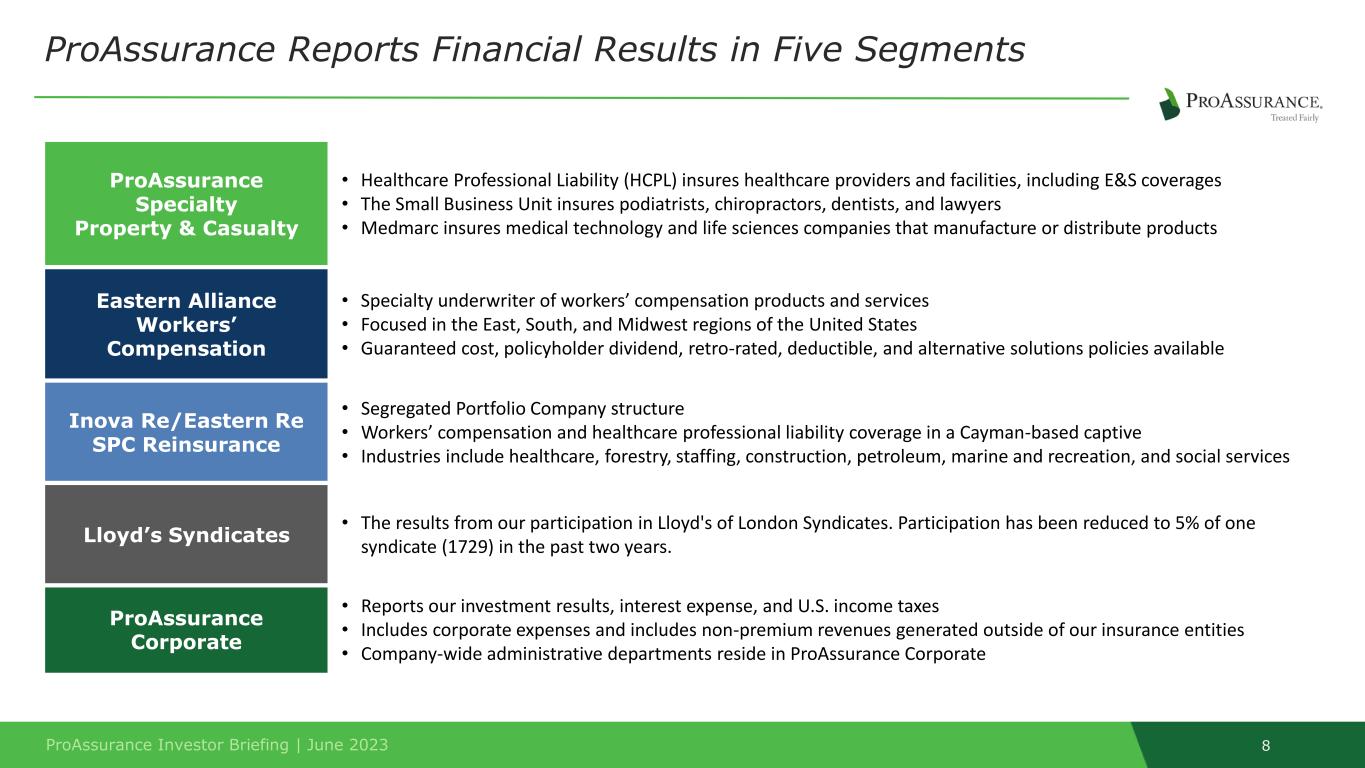 ProAssurance Investor Briefing | June 2023 7 ProAssurance Brand Profile Specialty P&C Healthcare Professional Liability Workers’ Comp Alternative Risk Transfer Medical Technology & Life Sciences Products Liability Legal Professional Liability