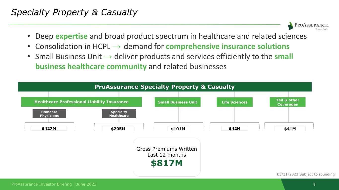 ProAssurance Investor Briefing | June 2023 8 ProAssurance Specialty Property & Casualty • Healthcare Professional Liability (HCPL) insures healthcare providers and facilities, including E&S coverages • The Small Business Unit insures podiatrists, chiropractors, dentists, and lawyers • Medmarc insures medical technology and life sciences companies that manufacture or distribute products Eastern Alliance Workers’ Compensation • Specialty underwriter of workers’ compensation products and services • Focused in the East, South, and Midwest regions of the United States • Guaranteed cost, policyholder dividend, retro-rated, deductible, and alternative solutions policies available Inova Re/Eastern Re SPC Reinsurance • Segregated Portfolio Company structure • Workers’ compensation and healthcare professional liability coverage in a Cayman-based captive • Industries include healthcare, forestry, staffing, construction, petroleum, marine and recreation, and social services Lloyd’s Syndicates • The results from our participation in Lloyd's of London Syndicates. Participation has been reduced to 5% of one syndicate (1729) in the past two years. ProAssurance Corporate • Reports our investment results, interest expense, and U.S. income taxes • Includes corporate expenses and includes non-premium revenues generated outside of our insurance entities • Company-wide administrative departments reside in ProAssurance Corporate ProAssurance Reports Financial Results in Five Segments