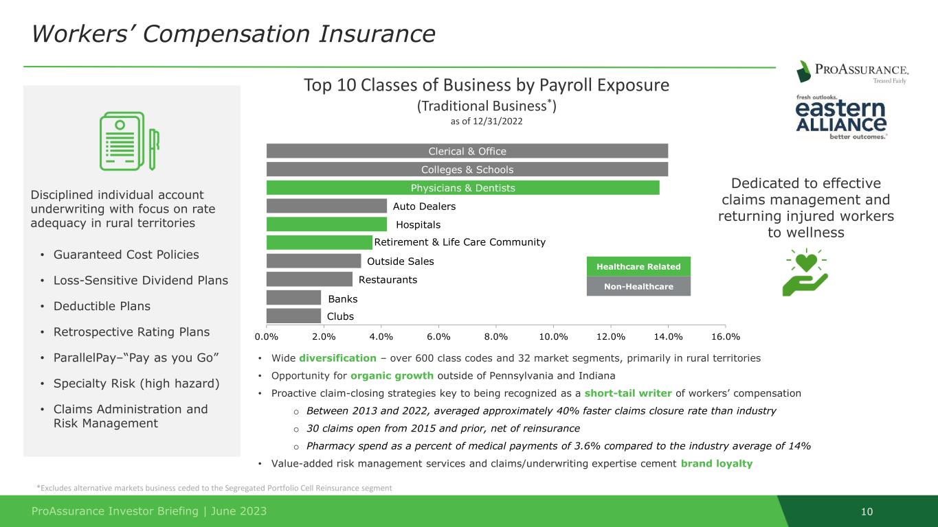 ProAssurance Investor Briefing | June 2023 9 ProAssurance Specialty Property & Casualty Specialty Healthcare Life SciencesSmall Business Unit Standard Physicians Healthcare Professional Liability Insurance $42M$101M$427M $205M Gross Premiums Written Last 12 months $817M Specialty Property & Casualty • Deep expertise and broad product spectrum in healthcare and related sciences • Consolidation in HCPL → demand for comprehensive insurance solutions • Small Business Unit → deliver products and services efficiently to the small business healthcare community and related businesses Tail & other Coverages $41M 03/31/2023 Subject to rounding