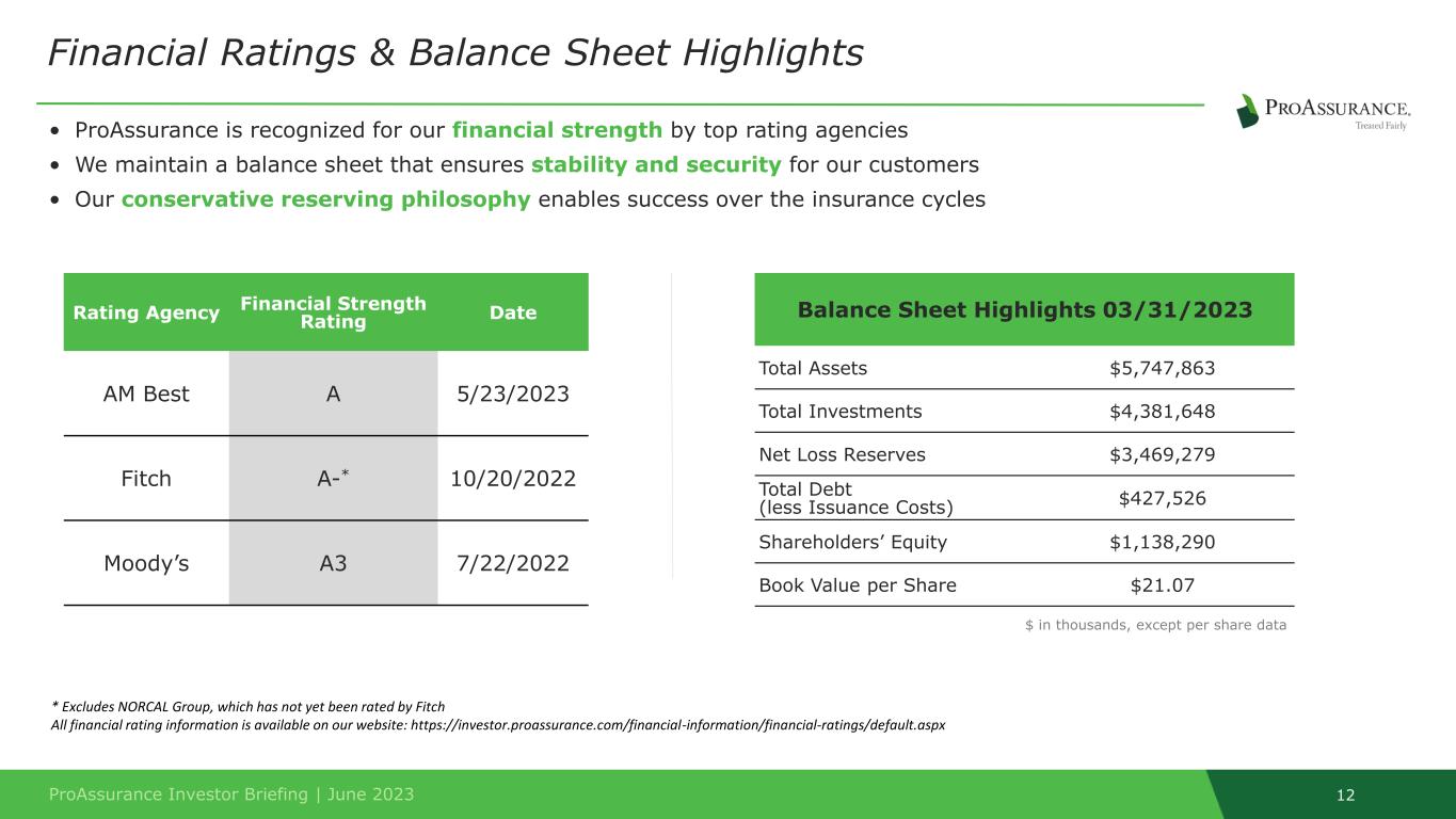 ProAssurance Investor Briefing | June 2023 11 Segregated Portfolio Cell Reinsurance ProAssurance Fronting Arrangement Agency Group or Association establishes a cell Underwriting Claims Administration Risk Management Reinsurance Audit Asset Management Services + Cell Rental Fees + Participation in profits/losses of selected cells Fee Income to PRA • HCPL and workers’ compensation captive insurance solutions through Inova Re (Cayman Islands) • SPCs are a high ROE product with favorable retention results • Low capital requirement • Strategic partnerships with select independent agencies looking to manage controllable expenses • Alternative market solutions are in high demand • Value-added risk management services and claims/underwriting expertise Inova Re Services As of 03/31/2023 • Gross premiums written YTD: $23M o Workers’ Compensation Insurance: $20M o Healthcare Professional Liability: $3M • 23 active cells Individually capitalized cells (companies) exist within the Inova Re structure. Assets of each are segregated from others. ProAssurance/Eastern participates in select cells