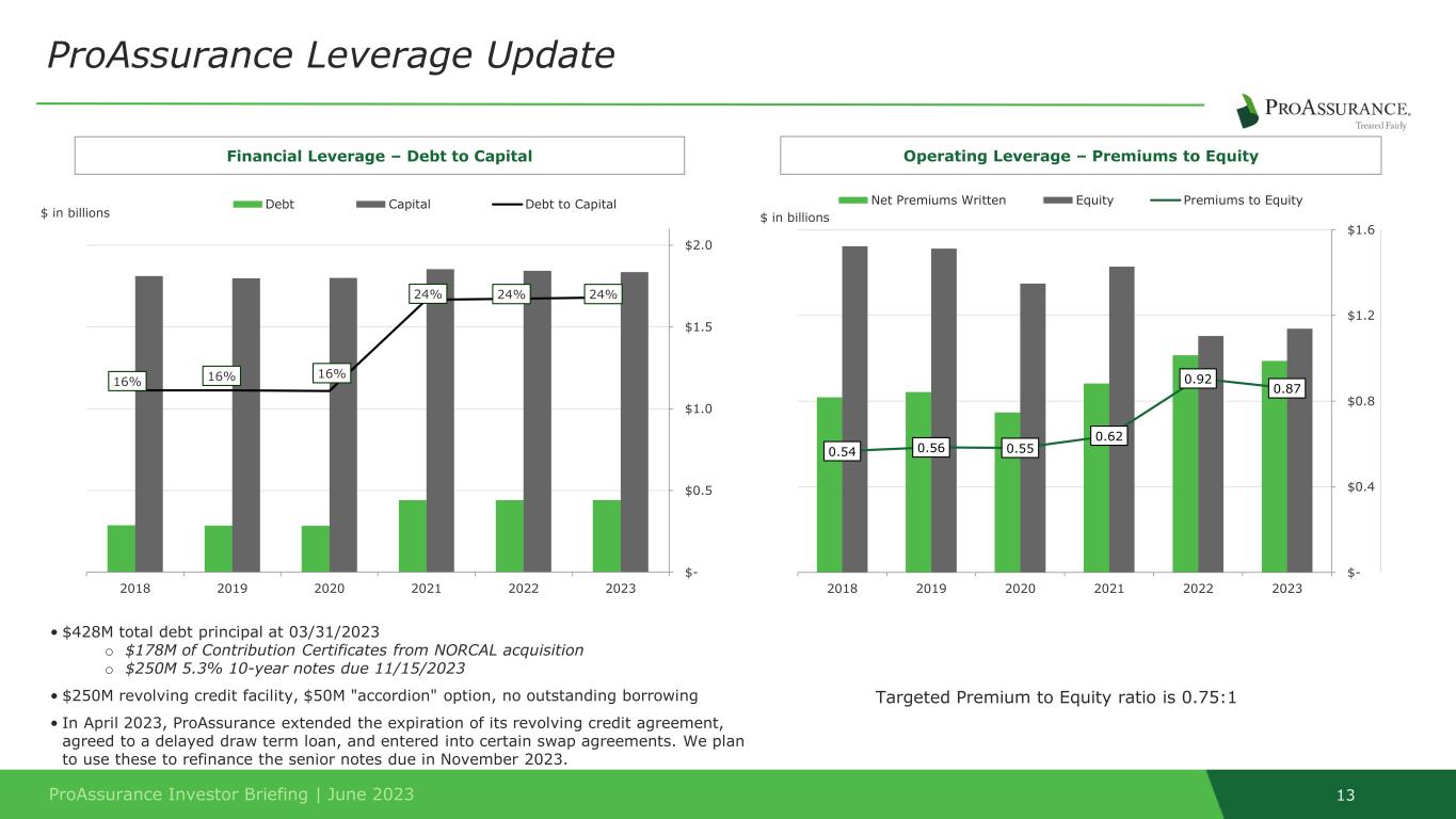 ProAssurance Investor Briefing | June 2023 13 • $428M total debt principal at 03/31/2023 o $178M of Contribution Certificates from NORCAL acquisition o $250M 5.3% 10-year notes due 11/15/2023 • $250M revolving credit facility, $50M "accordion" option, no outstanding borrowing • In April 2023, ProAssurance extended the expiration of its revolving credit agreement, agreed to a delayed draw term loan, and entered into certain swap agreements. We plan to use these to refinance the senior notes due in November 2023. ProAssurance Leverage Update Targeted Premium to Equity ratio is 0.75:1 Financial Leverage – Debt to Capital Operating Leverage – Premiums to Equity 16% 16% 16% 24% 24% 24% $- $0.5 $1.0 $1.5 $2.0 2018 2019 2020 2021 2022 2023 $ in billions Debt Capital Debt to Capital 0.54 0.56 0.55 0.62 0.92 0.87 $- $0.4 $0.8 $1.2 $1.6 2018 2019 2020 2021 2022 2023 $ in billions Net Premiums Written Equity Premiums to Equity
