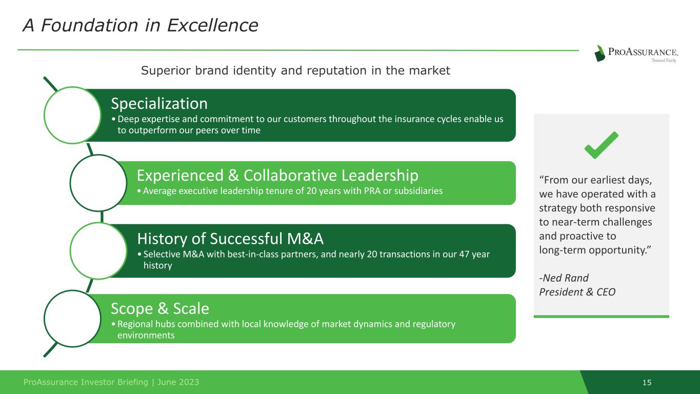 ProAssurance Investor Briefing | June 2023 3 Mission, Vision, & Values The ProAssurance Mission We Protect Others. Corporate Values Integrity | Leadership | Relationships | Enthusiasm Our Brand Promise We will honor these values in the execution of treated fairly to perform our mission and realize our vision.