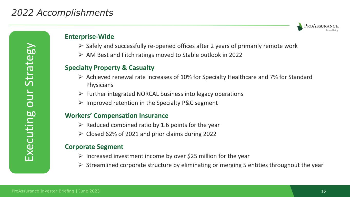 ProAssurance Investor Briefing | June 2023 15 A Foundation in Excellence “From our earliest days, we have operated with a strategy both responsive to near-term challenges and proactive to long-term opportunity.” -Ned Rand President & CEO Superior brand identity and reputation in the market Specialization • Deep expertise and commitment to our customers throughout the insurance cycles enable us to outperform our peers over time Experienced & Collaborative Leadership • Average executive leadership tenure of 20 years with PRA or subsidiaries History of Successful M&A • Selective M&A with best-in-class partners, and nearly 20 transactions in our 47 year history Scope & Scale • Regional hubs combined with local knowledge of market dynamics and regulatory environments