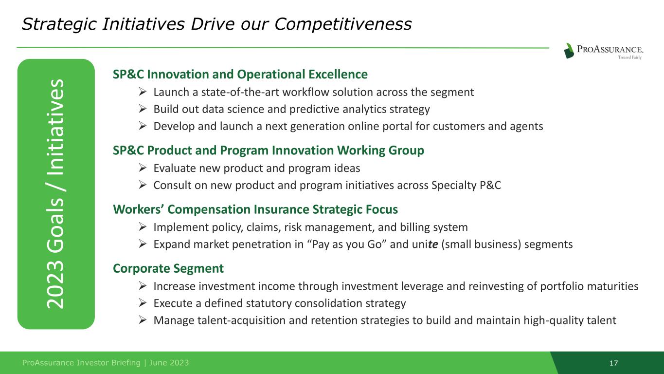 ProAssurance Investor Briefing | June 2023 16 Ex ec u ti n g o u r St ra te gy Enterprise-Wide ➢ Safely and successfully re-opened offices after 2 years of primarily remote work ➢ AM Best and Fitch ratings moved to Stable outlook in 2022 Specialty Property & Casualty ➢ Achieved renewal rate increases of 10% for Specialty Healthcare and 7% for Standard Physicians ➢ Further integrated NORCAL business into legacy operations ➢ Improved retention in the Specialty P&C segment Workers’ Compensation Insurance ➢ Reduced combined ratio by 1.6 points for the year ➢ Closed 62% of 2021 and prior claims during 2022 Corporate Segment ➢ Increased investment income by over $25 million for the year ➢ Streamlined corporate structure by eliminating or merging 5 entities throughout the year 2022 Accomplishments