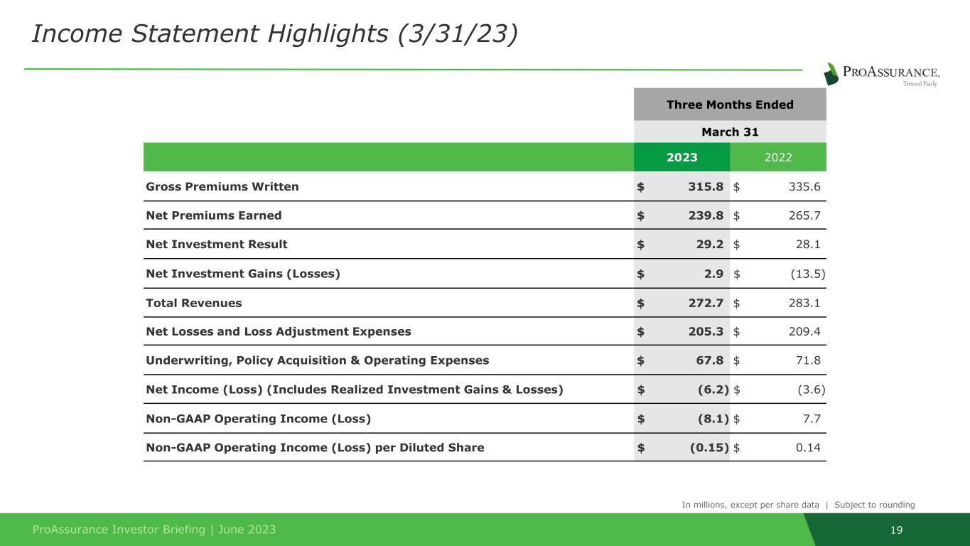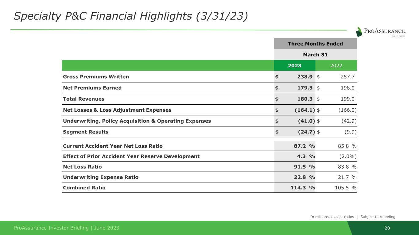 ProAssurance Investor Briefing | June 2023 19 Income Statement Highlights (3/31/23) Three Months Ended March 31 2023 2022 Gross Premiums Written $ 315.8 $ 335.6 Net Premiums Earned $ 239.8 $ 265.7 Net Investment Result $ 29.2 $ 28.1 Net Investment Gains (Losses) $ 2.9 $ (13.5) Total Revenues $ 272.7 $ 283.1 Net Losses and Loss Adjustment Expenses $ 205.3 $ 209.4 Underwriting, Policy Acquisition & Operating Expenses $ 67.8 $ 71.8 Net Income (Loss) (Includes Realized Investment Gains & Losses) $ (6.2) $ (3.6) Non-GAAP Operating Income (Loss) $ (8.1) $ 7.7 Non-GAAP Operating Income (Loss) per Diluted Share $ (0.15) $ 0.14 In millions, except per share data | Subject to rounding