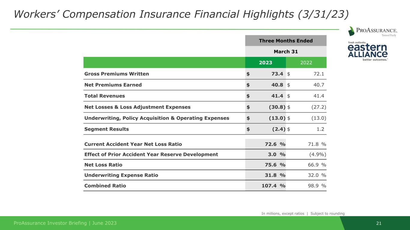 ProAssurance Investor Briefing | June 2023 20 Current Accident Year Net Loss Ratio 87.2 % 85.8 % Effect of Prior Accident Year Reserve Development 4.3 % (2.0%) Net Loss Ratio 91.5 % 83.8 % Underwriting Expense Ratio 22.8 % 21.7 % Combined Ratio 114.3 % 105.5 % Specialty P&C Financial Highlights (3/31/23) Three Months Ended March 31 2023 2022 Gross Premiums Written $ 238.9 $ 257.7 Net Premiums Earned $ 179.3 $ 198.0 Total Revenues $ 180.3 $ 199.0 Net Losses & Loss Adjustment Expenses $ (164.1) $ (166.0) Underwriting, Policy Acquisition & Operating Expenses $ (41.0) $ (42.9) Segment Results $ (24.7) $ (9.9) In millions, except ratios | Subject to rounding