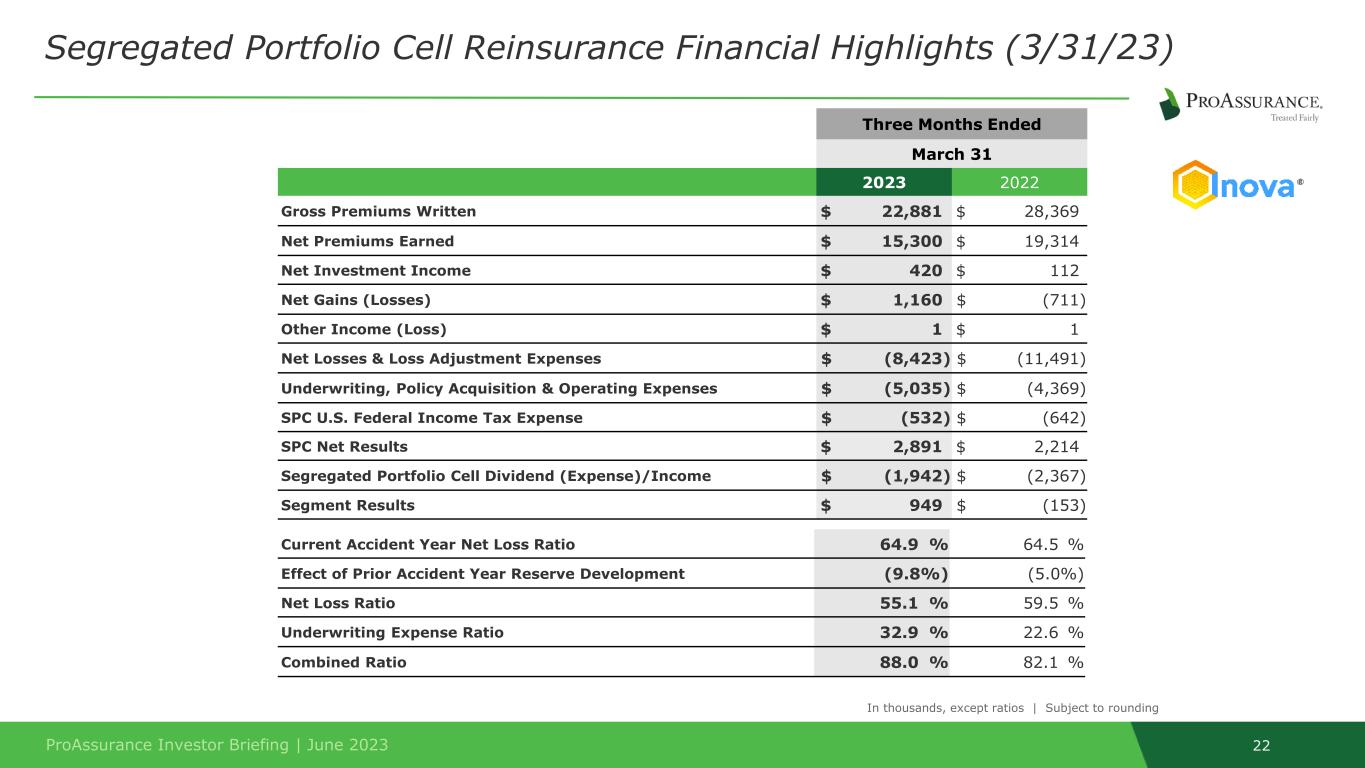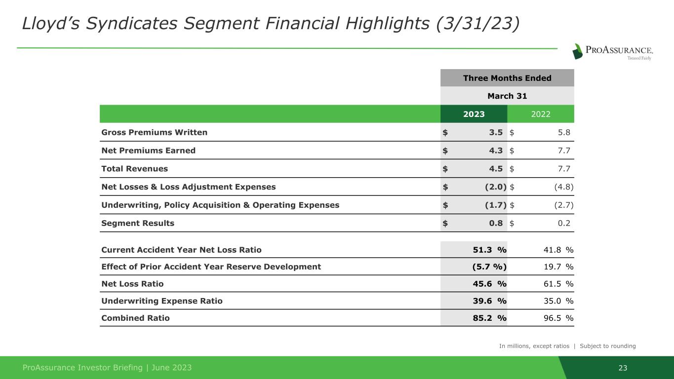 ProAssurance Investor Briefing | June 2023 22 Segregated Portfolio Cell Reinsurance Financial Highlights (3/31/23) Three Months Ended March 31 2023 2022 Gross Premiums Written $ 22,881 $ 28,369 Net Premiums Earned $ 15,300 $ 19,314 Net Investment Income $ 420 $ 112 Net Gains (Losses) $ 1,160 $ (711) Other Income (Loss) $ 1 $ 1 Net Losses & Loss Adjustment Expenses $ (8,423) $ (11,491) Underwriting, Policy Acquisition & Operating Expenses $ (5,035) $ (4,369) SPC U.S. Federal Income Tax Expense $ (532) $ (642) SPC Net Results $ 2,891 $ 2,214 Segregated Portfolio Cell Dividend (Expense)/Income $ (1,942) $ (2,367) Segment Results $ 949 $ (153) In thousands, except ratios | Subject to rounding Current Accident Year Net Loss Ratio 64.9 % 64.5 % Effect of Prior Accident Year Reserve Development (9.8%) (5.0%) Net Loss Ratio 55.1 % 59.5 % Underwriting Expense Ratio 32.9 % 22.6 % Combined Ratio 88.0 % 82.1 %