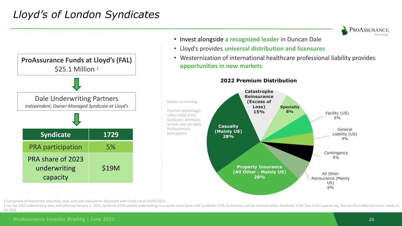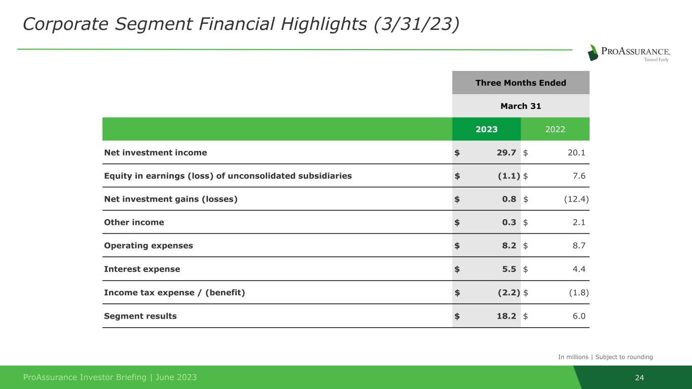 ProAssurance Investor Briefing | June 2023 23 Lloyd’s Syndicates Segment Financial Highlights (3/31/23) Three Months Ended March 31 2023 2022 Gross Premiums Written $ 3.5 $ 5.8 Net Premiums Earned $ 4.3 $ 7.7 Total Revenues $ 4.5 $ 7.7 Net Losses & Loss Adjustment Expenses $ (2.0) $ (4.8) Underwriting, Policy Acquisition & Operating Expenses $ (1.7) $ (2.7) Segment Results $ 0.8 $ 0.2 Current Accident Year Net Loss Ratio 51.3 % 41.8 % Effect of Prior Accident Year Reserve Development (5.7 %) 19.7 % Net Loss Ratio 45.6 % 61.5 % Underwriting Expense Ratio 39.6 % 35.0 % Combined Ratio 85.2 % 96.5 % In millions, except ratios | Subject to rounding