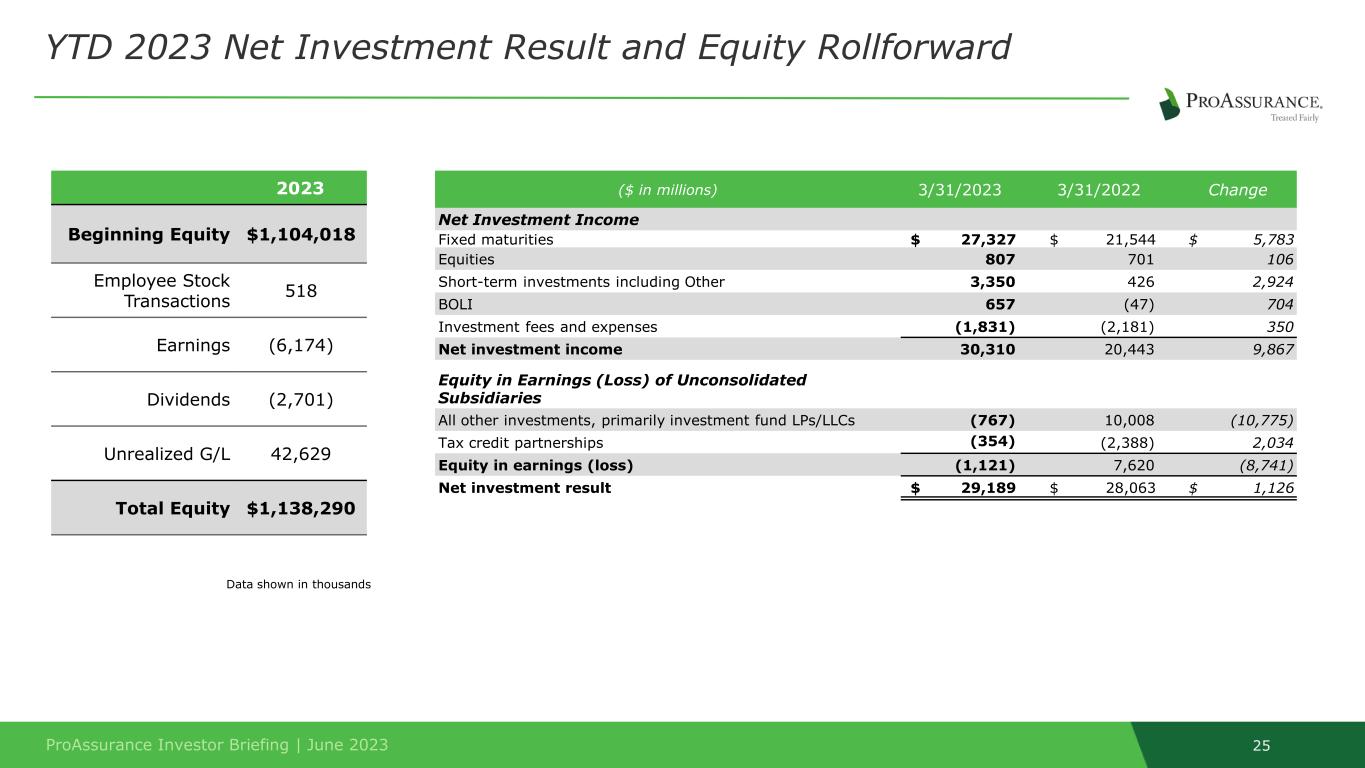ProAssurance Investor Briefing | June 2023 24 Corporate Segment Financial Highlights (3/31/23) Three Months Ended March 31 2023 2022 Net investment income $ 29.7 $ 20.1 Equity in earnings (loss) of unconsolidated subsidiaries $ (1.1) $ 7.6 Net investment gains (losses) $ 0.8 $ (12.4) Other income $ 0.3 $ 2.1 Operating expenses $ 8.2 $ 8.7 Interest expense $ 5.5 $ 4.4 Income tax expense / (benefit) $ (2.2) $ (1.8) Segment results $ 18.2 $ 6.0 In millions | Subject to rounding