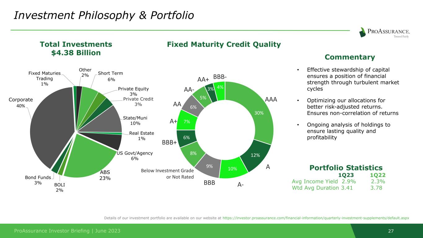 ProAssurance Investor Briefing | June 2023 27 Investment Philosophy & Portfolio Total Investments $4.38 Billion 03/31/2023 Subject to rounding Details of our investment portfolio are available on our website at https://investor.proassurance.com/financial-information/quarterly-investment-supplements/default.aspx 30% 12% 10%9% 8% 6% 7% 6% 5% 3% 4% AAA A A+ BBB+ Below Investment Grade or Not Rated BBB A- AA- AA AA+ BBB- Fixed Maturity Credit Quality Portfolio Statistics 1Q23 1Q22 Avg Income Yield 2.9% 2.3% Wtd Avg Duration 3.41 3.78 Commentary • Effective stewardship of capital ensures a position of financial strength through turbulent market cycles • Optimizing our allocations for better risk-adjusted returns. Ensures non-correlation of returns • Ongoing analysis of holdings to ensure lasting quality and profitability ABS 23% BOLI 2% Bond Funds 3% Corporate 40% Fixed Maturies Trading 1% Other 2% Short Term 7% Private Equity 3% Private Credit 3% State/Muni 10% Real Estate 1% US Govt/Agency 6% 6