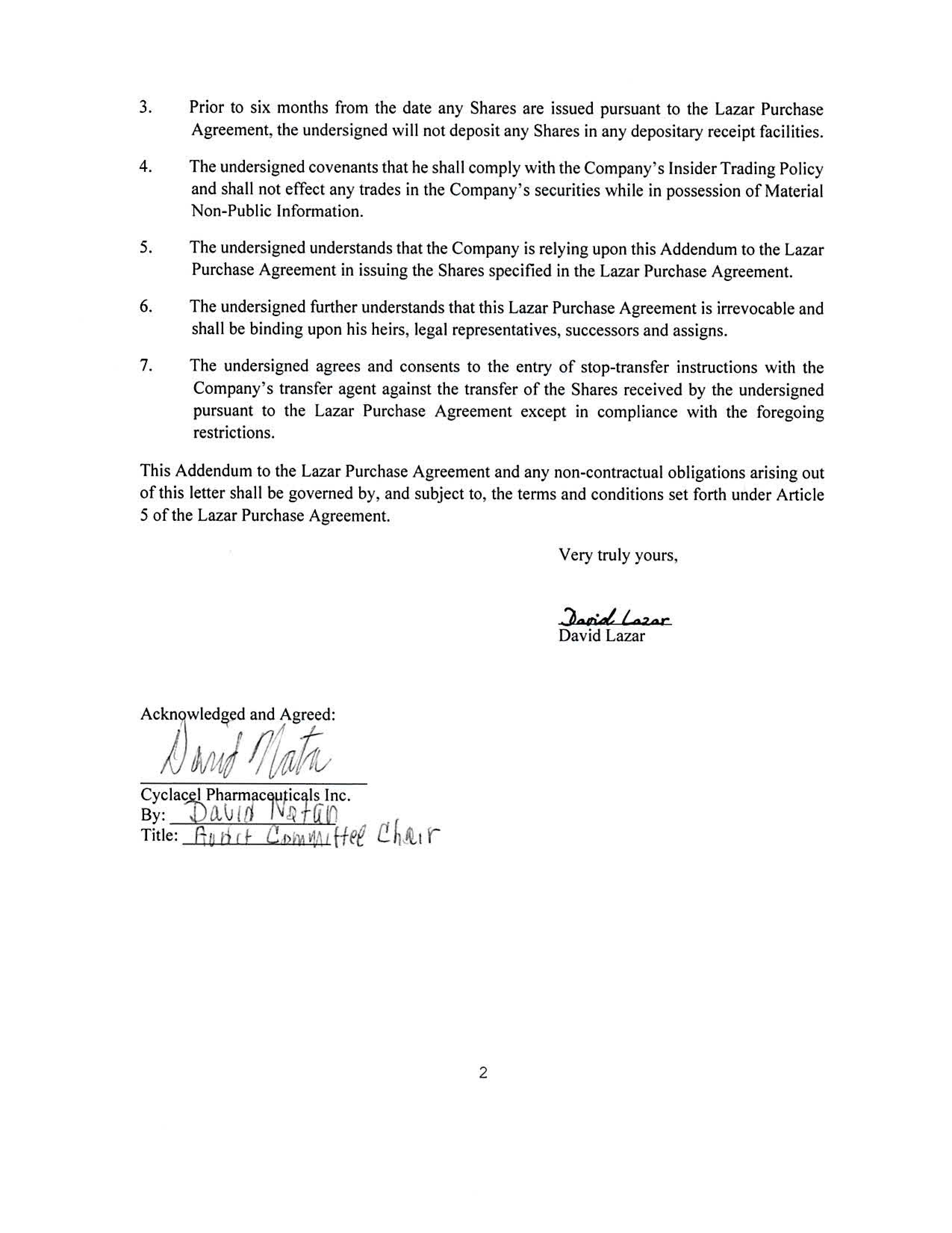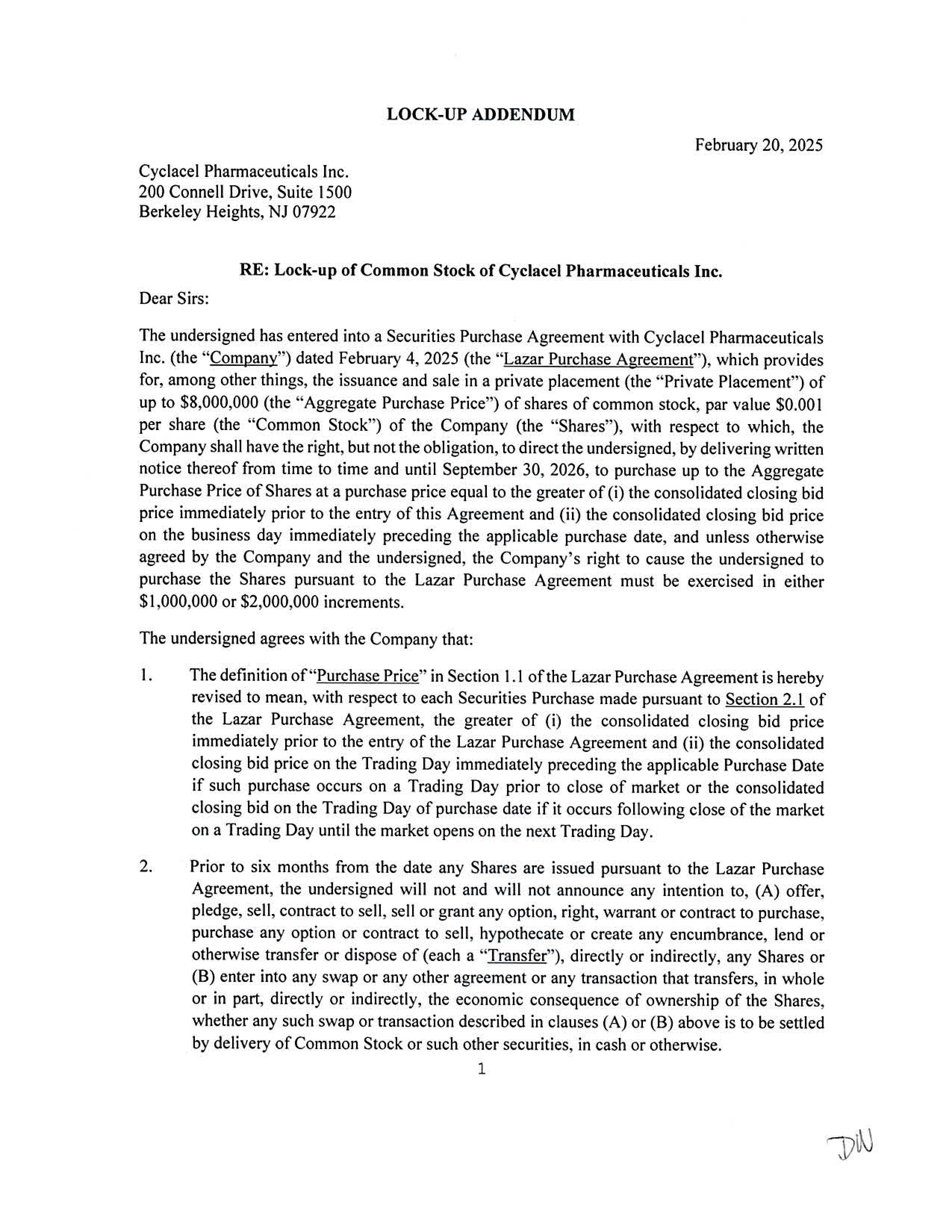 LOCK - UP ADDENDUM 1 February 20, 2025 Cyclacel Phannaceuticals Inc . 200 Connell Drive, Suite 1500 Berkeley Heights, NJ 07922 RE: Lock - up of Common Stock of Cyclacel Pharmaceuticals Inc. Dear Sirs : The undersigned has ent e red int o a Securities Purchase Agreement with Cyclacel Pharmaceuticals Inc . (the "Compan y" ) dated February 4 , 2025 (the "Lazar Pur c hase Agreement " ) , which provides for, among other things , the issuance and sale in a private placement (the " Private Placement " ) of up to $ 8 , 000 , 000 (the " Aggregate Purchase Price " ) of shares of common stock , par value $ 0 . 001 per share (the "Common Stock " ) of the Company (the " Shares"), with respect to which, the Company shall have the right , but not the obligation, to direct the undersigned , by delivering written notice thereof from time to time and until September 30 , 2026 , to purchase up to the Aggregate Purchase Price of Shares at a purchase price equal to the greater of (i) the consolidated closing bid price immediately prior to the entry of this Agreement and (ii) the consolidated closing bid price on the business day immediately preceding the applicable purchase date , and unless otherwise agreed by the Company and the undersigned , the Company ' s right to cause the undersigned to purchase the Shares pursuant to the Lazar Purchase Agreement must be exercised in either $ 1 , 000 , 000 or $ 2 , 000 , 000 increments . The undersigned agrees with the Company that : I. The definition of " Purchase Price " in Section 1 . 1 of the Lazar Purcha s e Agreement is hereby revised to mean , with respect to each Securities Purchase made pursuant to Section 2 . 1 of the Lazar Purchase Agreement , the greater of (i) the consolidated closing bid price immediately prior to the entry of the Lazar Purcha s e Agreement and (ii) the consolidated closing bid price on the Trading Day immediately preceding the applicable Purchase Date if such purchase occurs on a Trading Day prior to close of market or the consolidated closing bid on the Trading Day of purchase date if it occurs following close of the market on a Trading Day until the market opens on the next Trading Day . 2. Prior to six month s from the date any Share s are issued pursuant to the Lazar Purchase Agreement , the undersigned will not and will not announce any intention to , (A) offer , pledge , sell , contract to sell , sell or grant any option , right , warrant or contract to purchase , purchase any option or contract to s e ll , hyp o thecate or create any encumbrance , lend or otherwise transfer or dispose of (each a " Transfer ") , directl y or indirectly , any Shares or ( 8 ) enter into any s wap or any other agreement or any transaction that transfers , in whole or in part, directly or indirectly , the e conomic consequence of ownership of the Shares , whether any such swap or transaction de s cribed in clauses (A) or ( 8 ) above is to be settled by delivery of Common Stock or such other securities , in cash or otherwise .