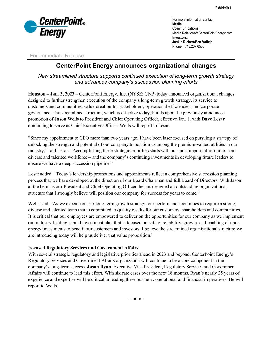 For Immediate Release For more information contact Media: Communications Media.Relations@CenterPointEnergy.com Investors: Jackie Richert/Ben Vallejo Phone 713.207.6500 CenterPoint Energy announces organizational changes New streamlined structure supports continued execution of long-term growth strategy and advances company’s succession planning efforts Houston – Jan. 3, 2023 – CenterPoint Energy, Inc. (NYSE: CNP) today announced organizational changes designed to further strengthen execution of the company’s long-term growth strategy, its service to customers and communities, value-creation for stakeholders, operational efficiencies, and corporate governance. The streamlined structure, which is effective today, builds upon the previously announced promotion of Jason Wells to President and Chief Operating Officer, effective Jan. 1, with Dave Lesar continuing to serve as Chief Executive Officer. Wells will report to Lesar. “Since my appointment to CEO more than two years ago, I have been laser focused on pursuing a strategy of unlocking the strength and potential of our company to position us among the premium-valued utilities in our industry,” said Lesar. “Accomplishing these strategic priorities starts with our most important resource – our diverse and talented workforce – and the company’s continuing investments in developing future leaders to ensure we have a deep succession pipeline.” Lesar added, “Today’s leadership promotions and appointments reflect a comprehensive succession planning process that we have developed at the direction of our Board Chairman and full Board of Directors. With Jason at the helm as our President and Chief Operating Officer, he has designed an outstanding organizational structure that I strongly believe will position our company for success for years to come.” Wells said, “As we execute on our long-term growth strategy, our performance continues to require a strong, diverse and talented team that is committed to quality results for our customers, shareholders and communities. It is critical that our employees are empowered to deliver on the opportunities for our company as we implement our industry-leading capital investment plan that is focused on safety, reliability, growth, and enabling cleaner energy investments to benefit our customers and investors. I believe the streamlined organizational structure we are introducing today will help us deliver that value proposition.” Focused Regulatory Services and Government Affairs With several strategic regulatory and legislative priorities ahead in 2023 and beyond, CenterPoint Energy’s Regulatory Services and Government Affairs organization will continue to be a core component in the company’s long-term success. Jason Ryan, Executive Vice President, Regulatory Services and Government Affairs will continue to lead this effort. With six rate cases over the next 18 months, Ryan’s nearly 25 years of experience and expertise will be critical in leading these business, operational and financial imperatives. He will report to Wells. - more - Exhibit 99.1